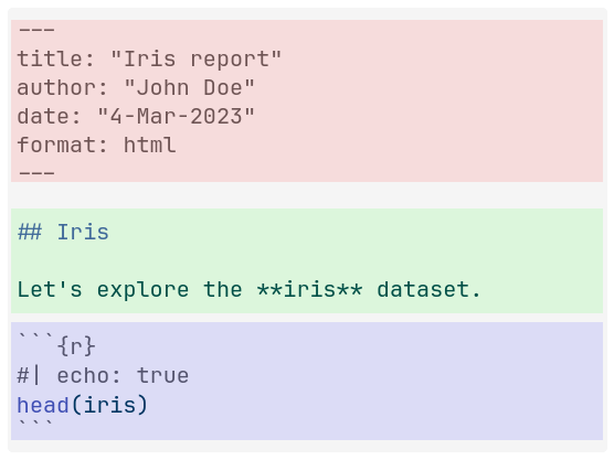 toc_depth becomes toc-depthnumber_sections becomes number-sectionscode_folding becomes code-fold#| echo: false rather than r{echo=FALSE}::: notation