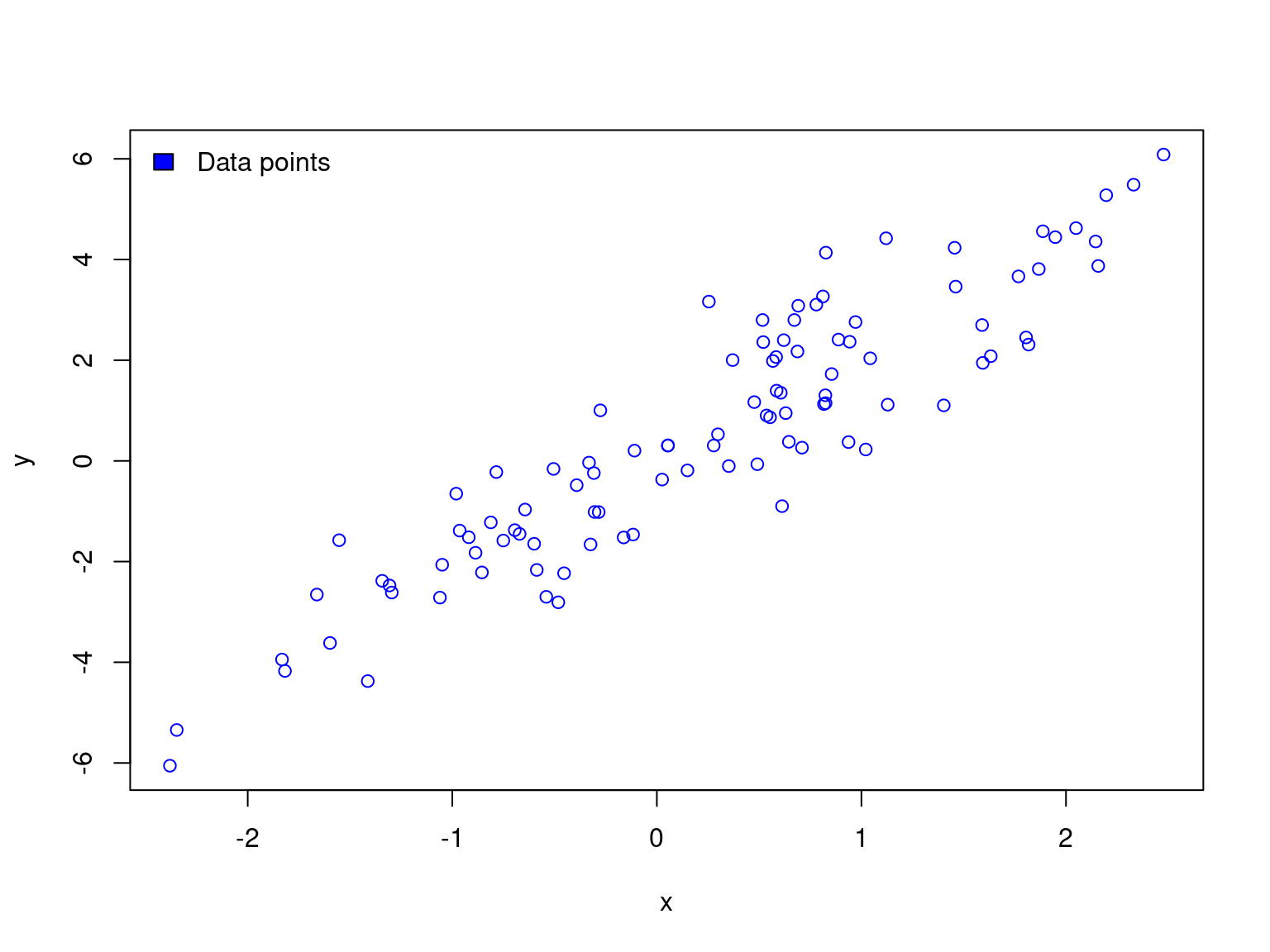 plot(y~x, xlab="X", ylab="Y"); abline(lm(y~x), col="blue", lwd=2); mtext("Y = 0.1*X + 2*rnorm(N, 0, 1)")