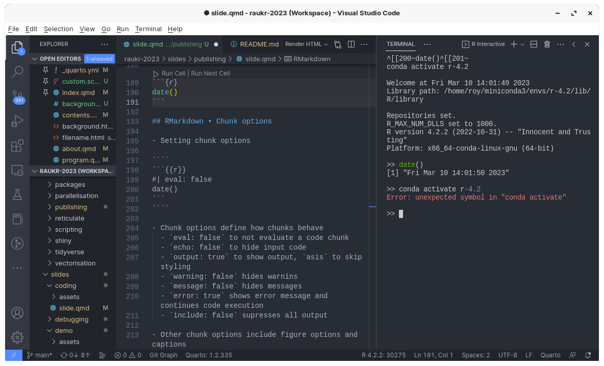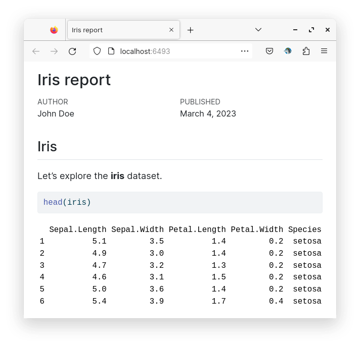 eval: false to not evaluate a code chunkecho: false to hide input codeoutput: true to show output, asis to skip stylingwarning: false hides warninsmessage: false hides messageserror: true shows error message and continues code executioninclude: false supresses all outputquarto::quarto_preview("report.qmd")quarto preview report.qmdquarto::quarto_render("report.qmd")quarto render report.qmdquarto render index.qmd
