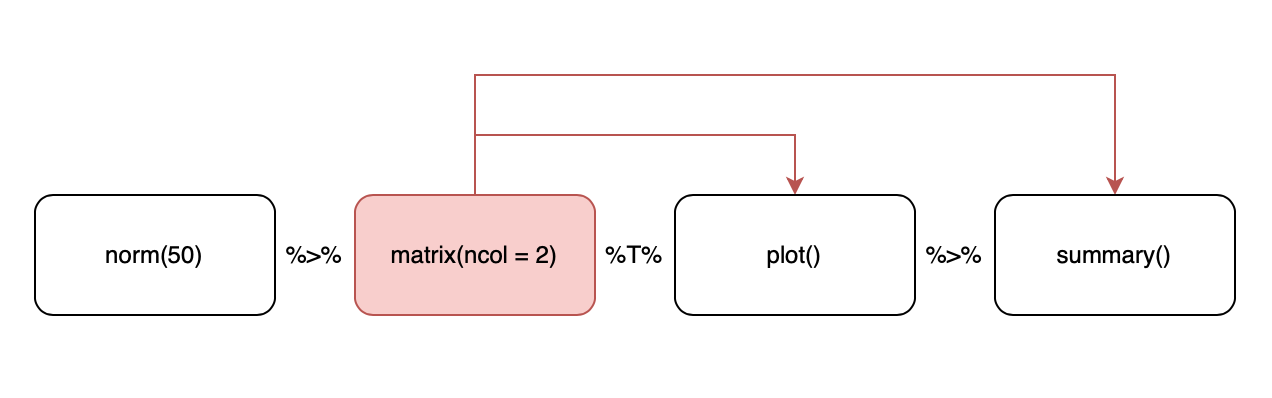 x %>% f(a = p(.), b = q(.)) \(\equiv\) f(x, a = p(x), b = q(x))x %>% {f(a = p(.), b = q(.))} \(\equiv\) f(a = p(x), b = q(x))We can even use placeholders as the first element of a pipe: