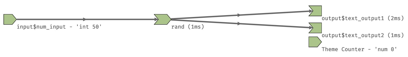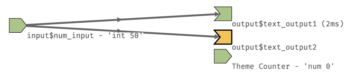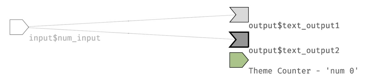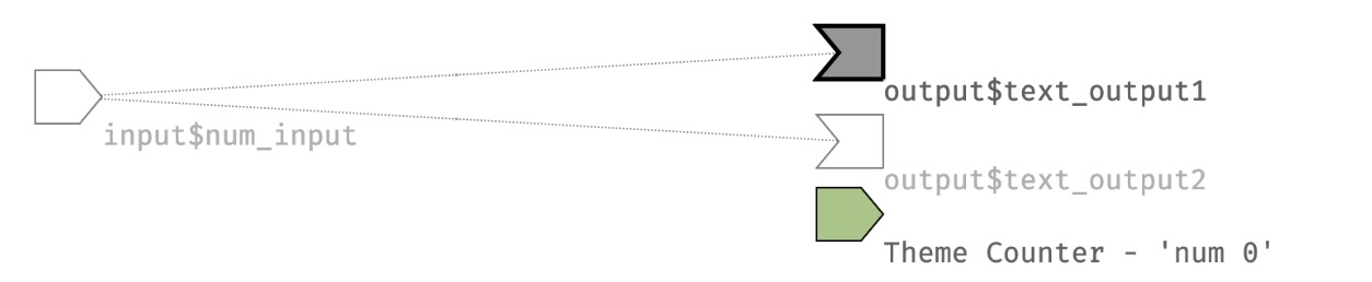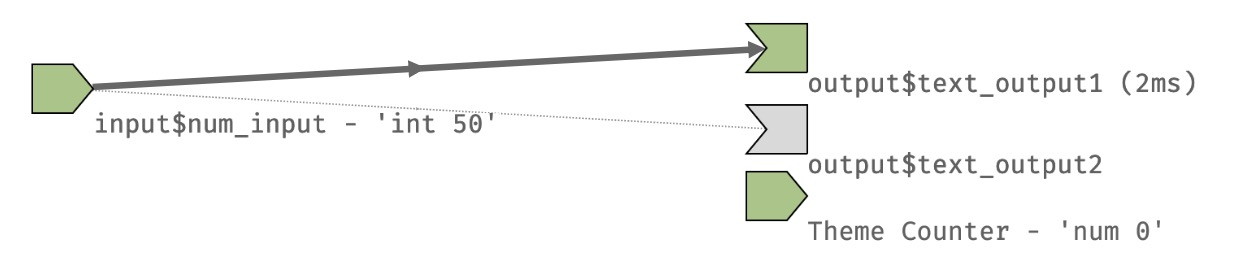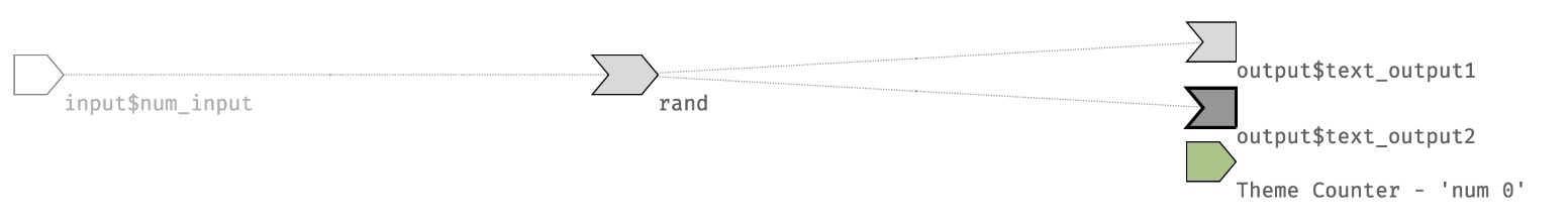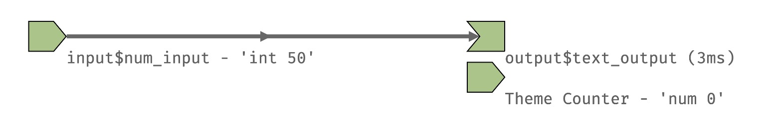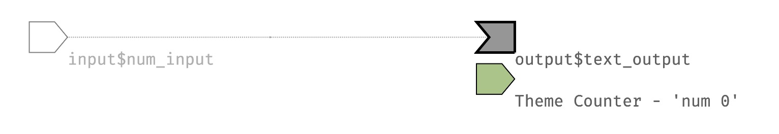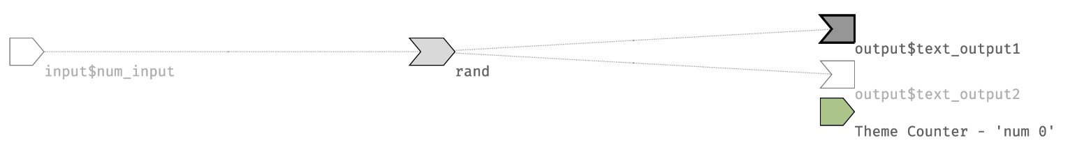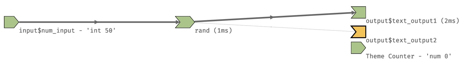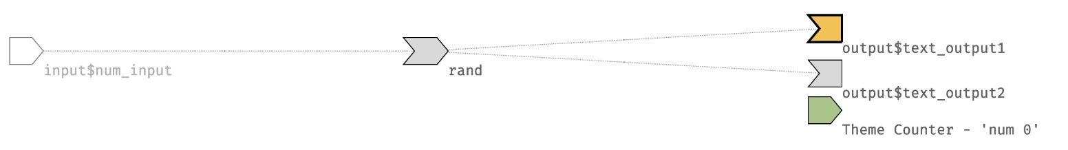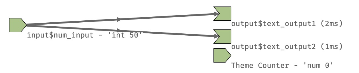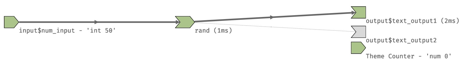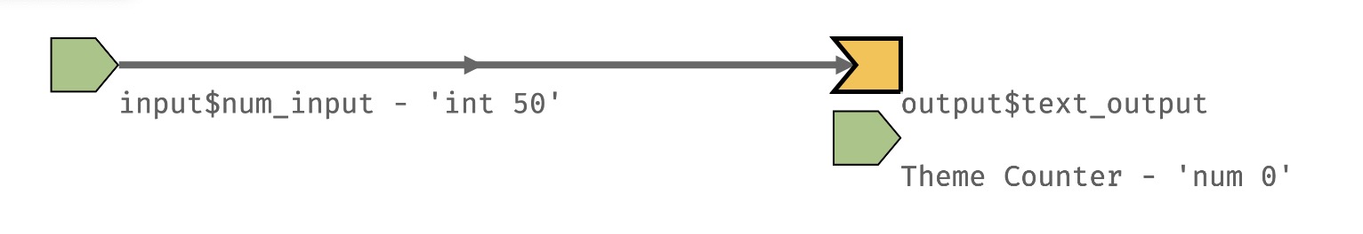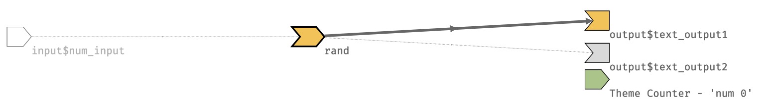reactive(): Defines an expressionreactiveVal(): Defines single valuereactiveValues(): Defines a list of valuesRegular function fn <- function(): Runs wherever it is is used