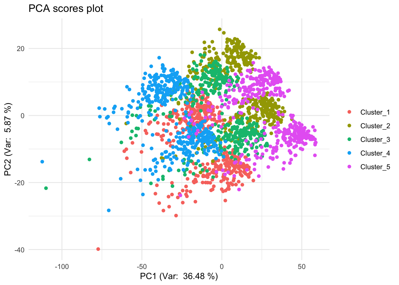 res_pca <- data.frame(PC1=pca$x[,1], PC2=pca$x[,2], PC3=pca$x[,3], PC4=pca$x[,4], PC5=pca$x[,5]) |>