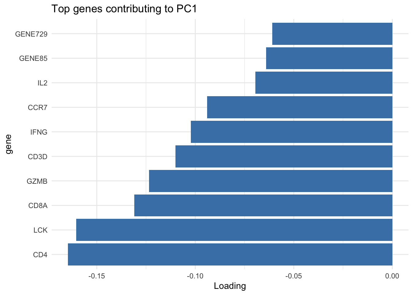 labs(title="Top genes contributing to PC1", x="gene", y="Loading") +