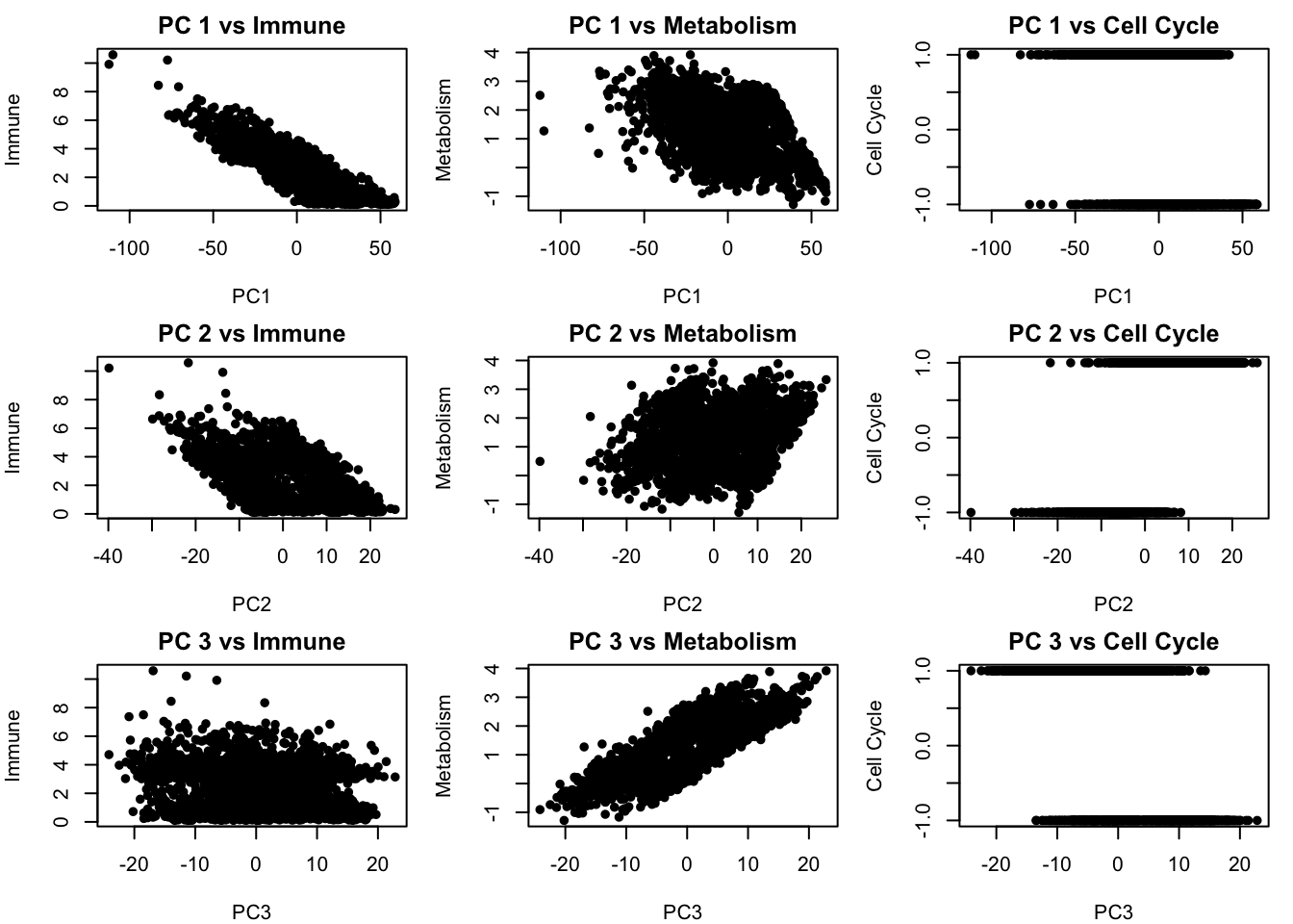 # This looks very similar to our true signal the first component is immune, the second is metabolism and the third captured cell cycle (see chapter). This is exactly what ICA is good at: recovering independent sources that were mixed across thousands of genes. It allows us to reduce the data to a few components that may correspond directly to real biological processes. This is something that PCA often fails to do when the sources overlap or have similar variance