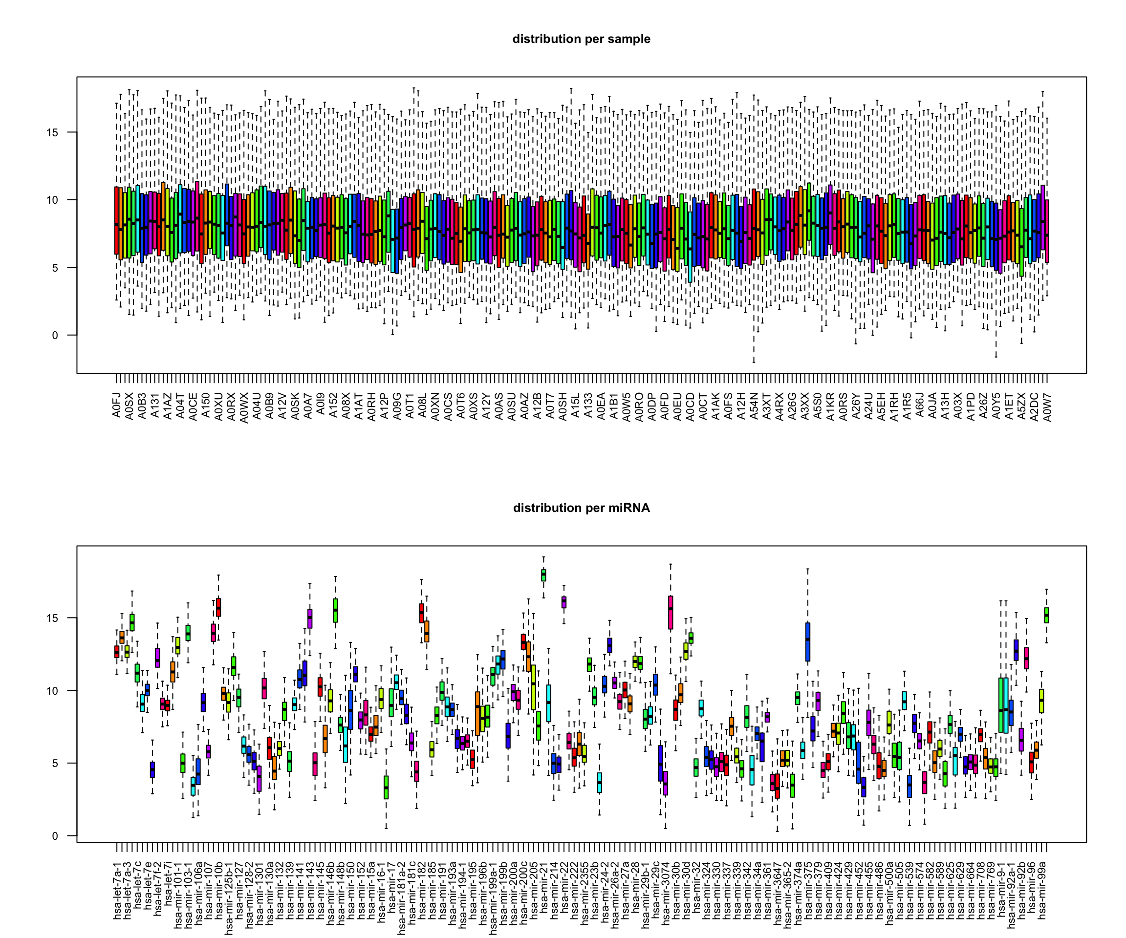boxplot(x, main="distribution per miRNA", las=2, cex.axis=0.7, col=rainbow(10), outline=FALSE, cex.main=0.8)