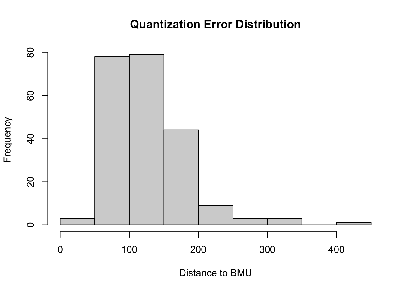 # - distances: Distance between each data point and its BMU (used to assess mapping quality)
