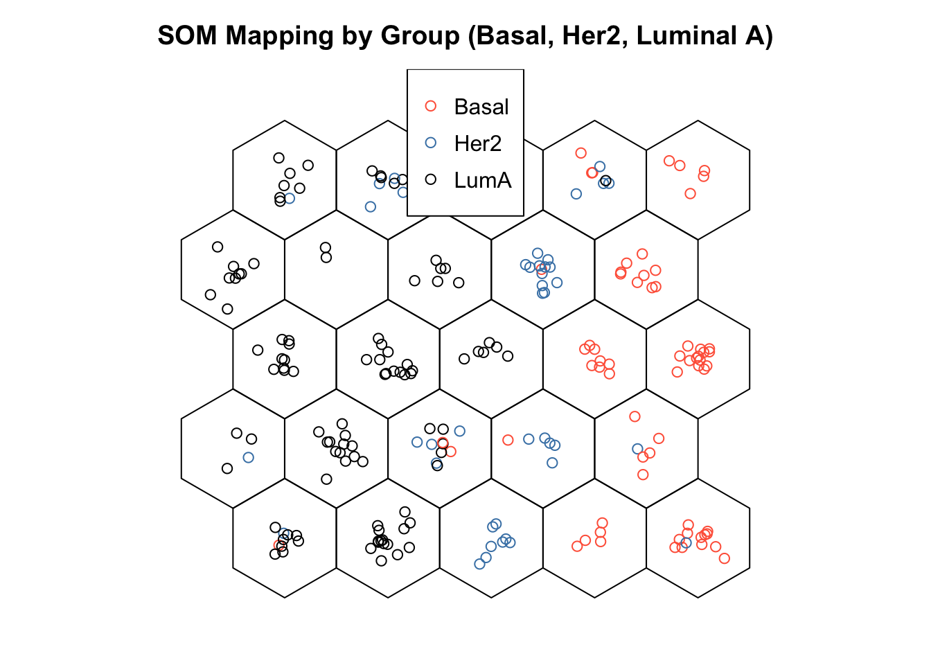 Supervised variants such as generalized SOMs now incorporate label information to guide map layout for classification tasks, while supervised Kohonen networks combine clustering with prediction, useful in clinical contexts like cancer prognosis. Multi-omics and multi-view extensions, including layered SOMs, allow integration of diverse data types (e.g., mRNA, miRNA, proteomics) by aligning SOM layers through shared topology. Time-aware models like SOMTimeS apply dynamic time warping to cluster biological time series such as longitudinal gene expression. In single-cell biology, FlowSOM efficiently handles millions of cytometry events and is widely adopted in platforms like Bioconductor. Visualization has improved with tools like U-Matrix++ and projection-based SOMs that embed t-SNE or UMAP to retain global data structure. Finally, scalable implementations using TensorFlow, PyTorch, or Julia have enabled SOMs to process large-scale omics and clinical datasets using GPU acceleration