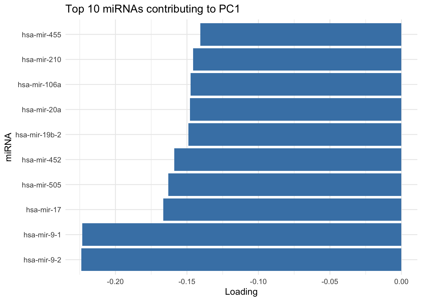 labs(title="Top 10 miRNAs contributing to PC1", x="miRNA", y="Loading") +