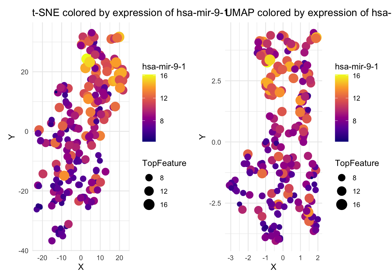 Investigate which miRNA features vary the most across the dataset. Features with high variance are more likely to influence clustering in dimensionality reduction. Identify top variable features in orginal (unscaled) data and visualize sample distribution colored by expression of top feature on the selected t-SNE and UMAP plots.