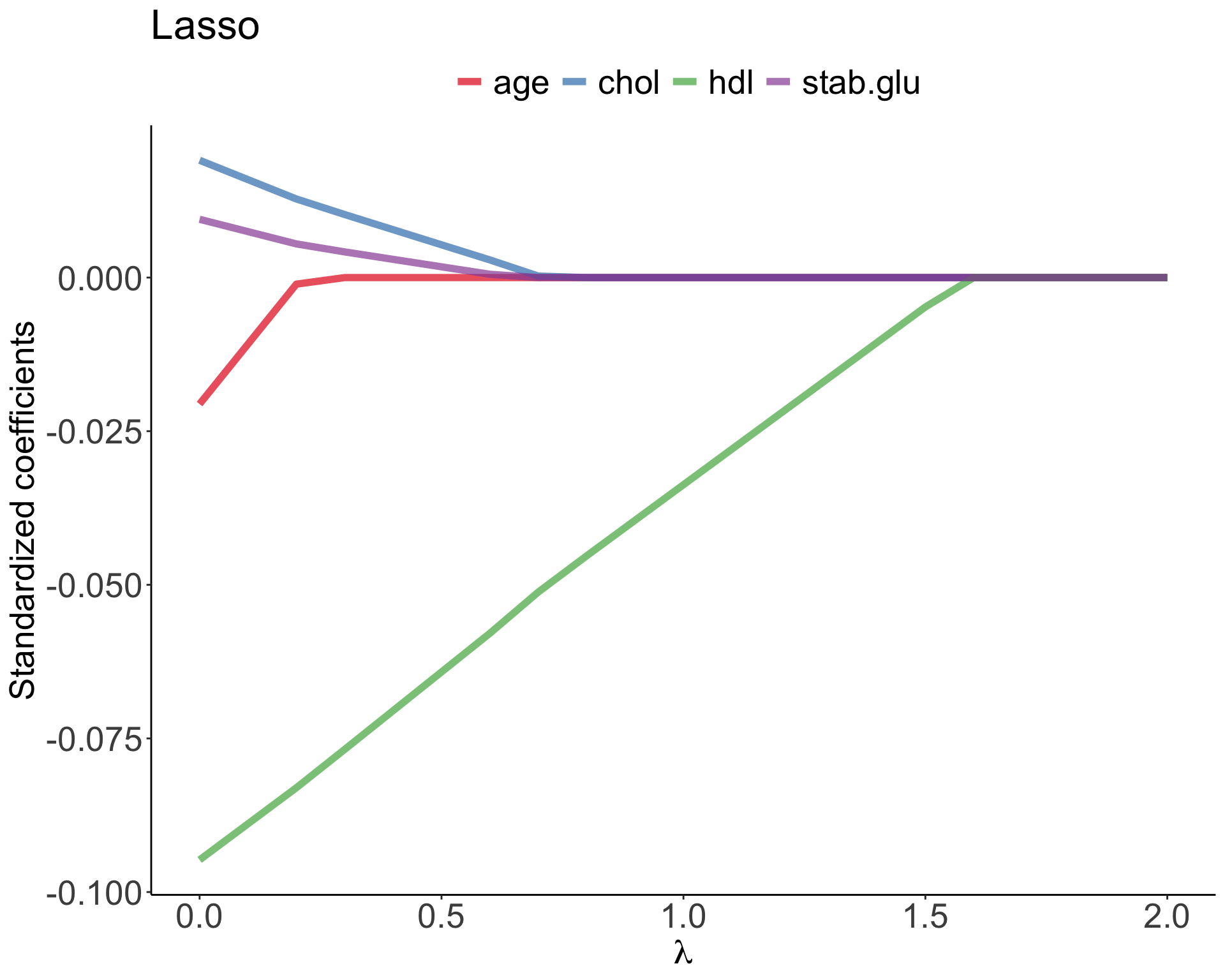 Example of Ridge regression to model BMI using age, chol, hdl and glucose variables: model coefficients are plotted over a range of lambda values, showing how initially for small lambda values all variables are part of the model and how they gradually shrink towards zero for larger lambda values.