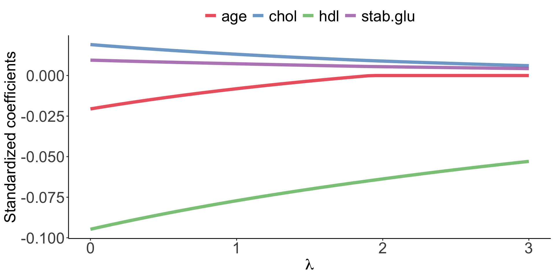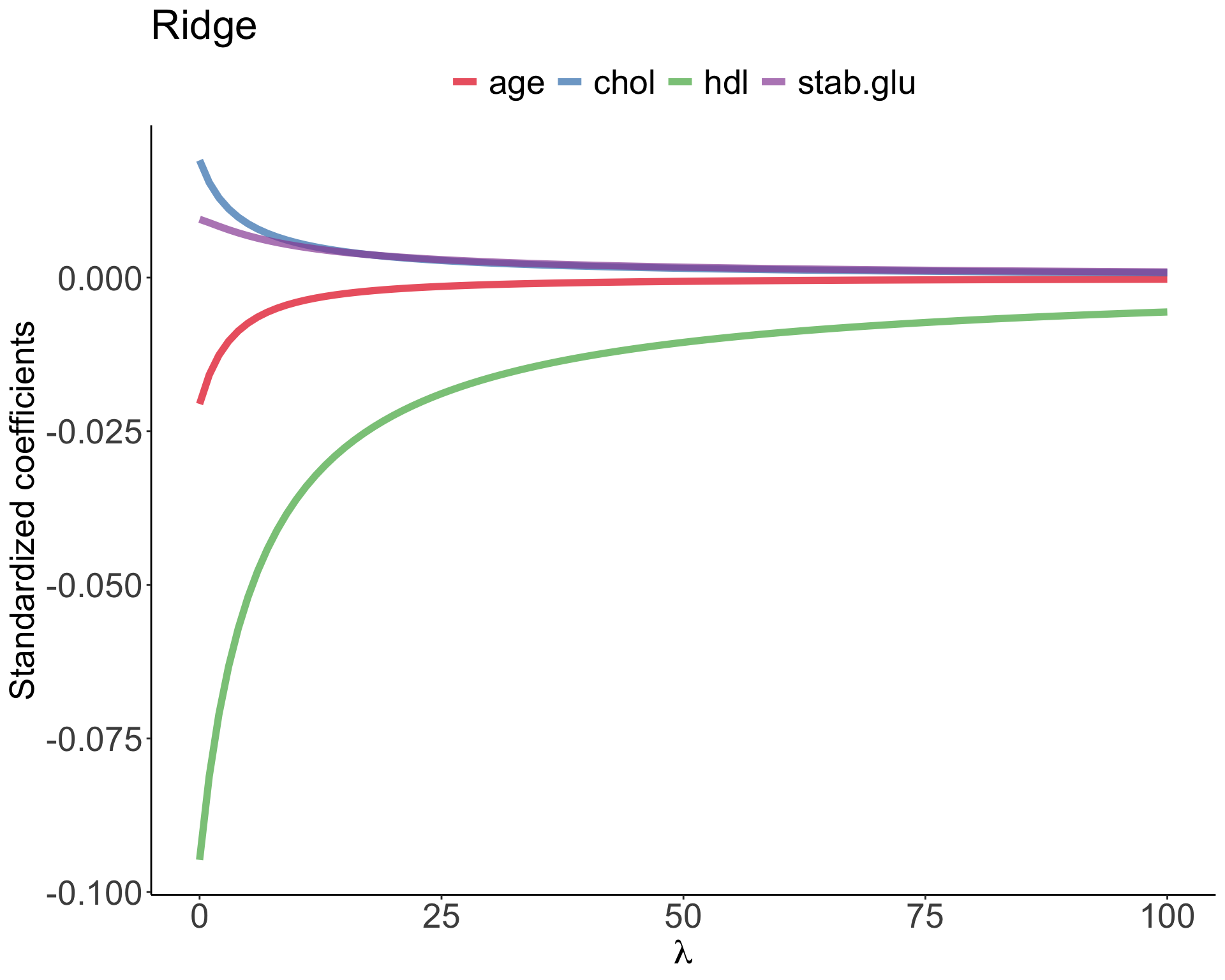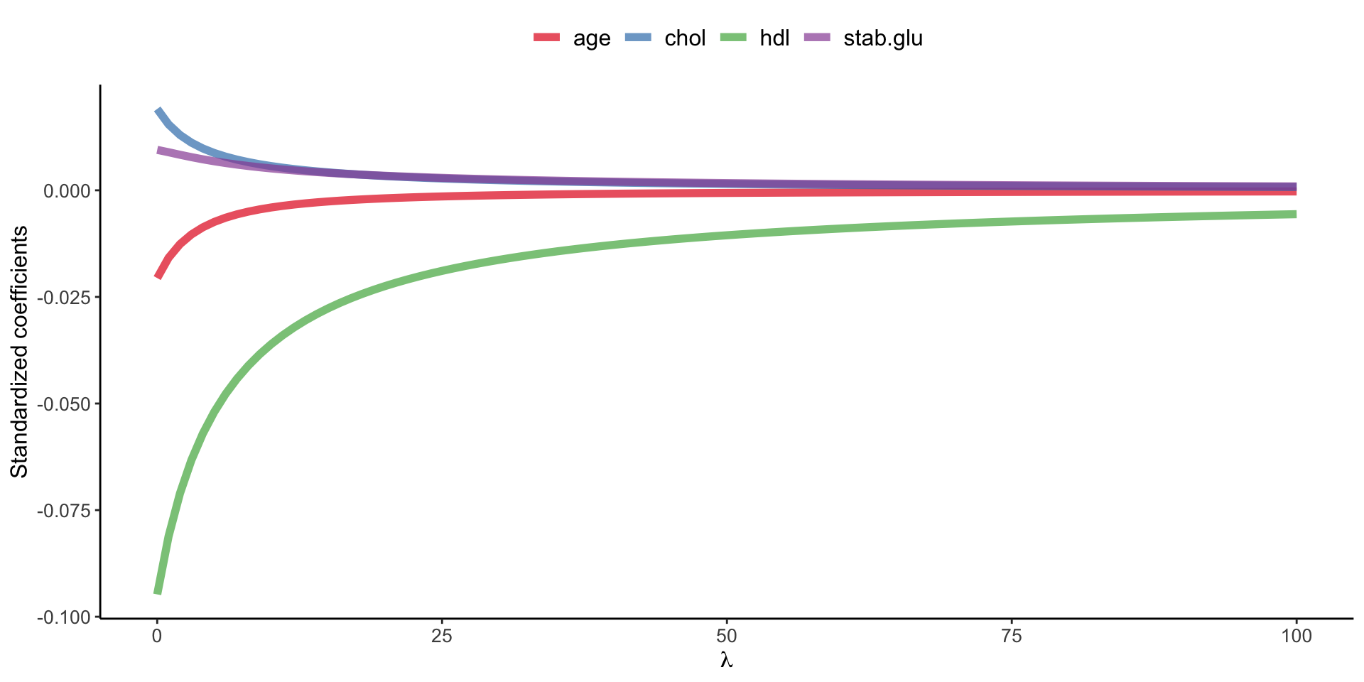 Example of Ridge regression to model BMI using age, chol, hdl and glucose variables: model coefficients are plotted over a range of lambda values, showing how initially for small lambda values all variables are part of the model and how they gradually shrink towards zero for larger lambda values.