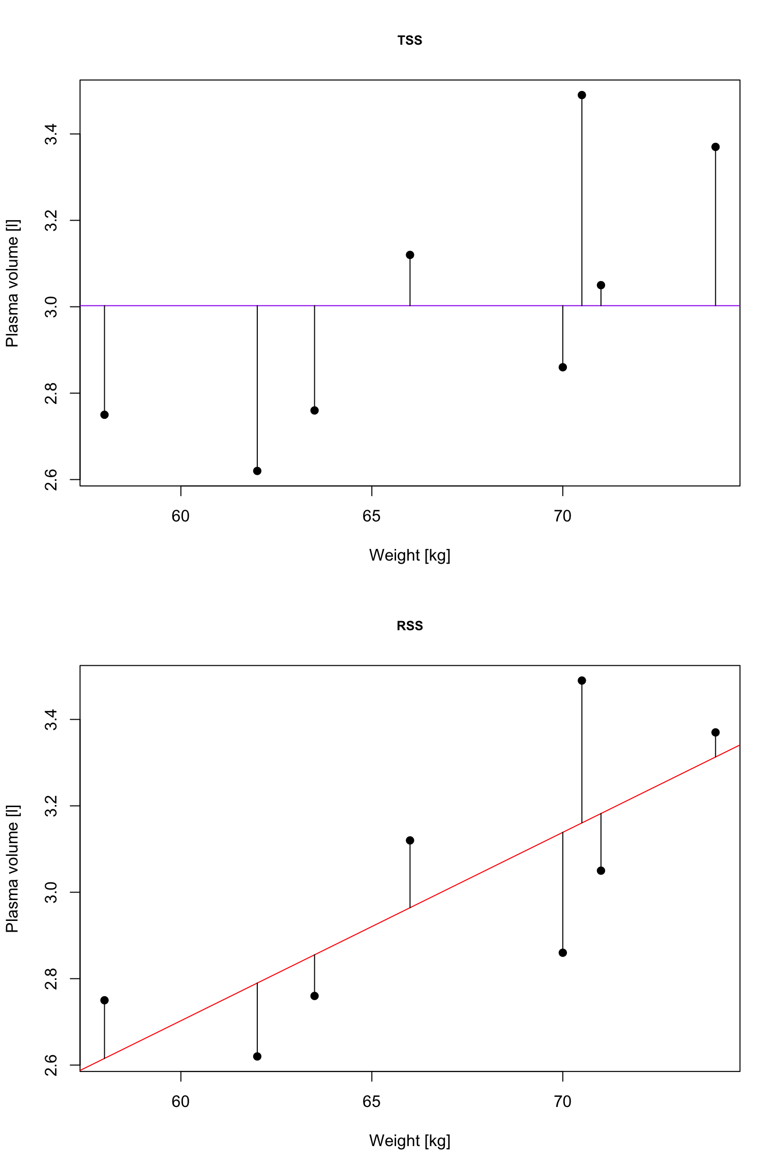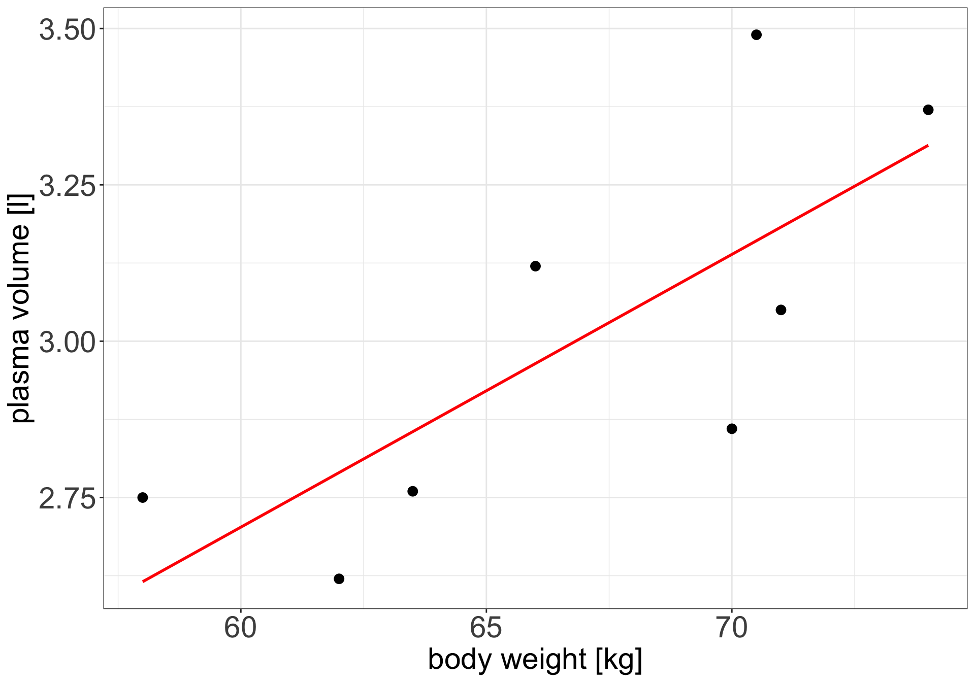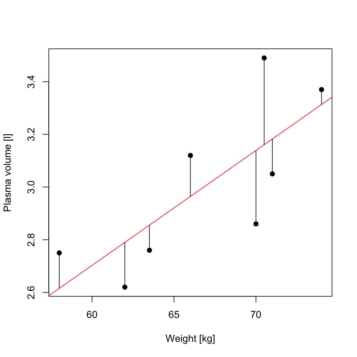 Example 1 (Weight and plasma volume) Let’s look at the example data containing body weight (kg) and plasma volume (liters) for eight healthy men to see what the best-fitting straight line is.