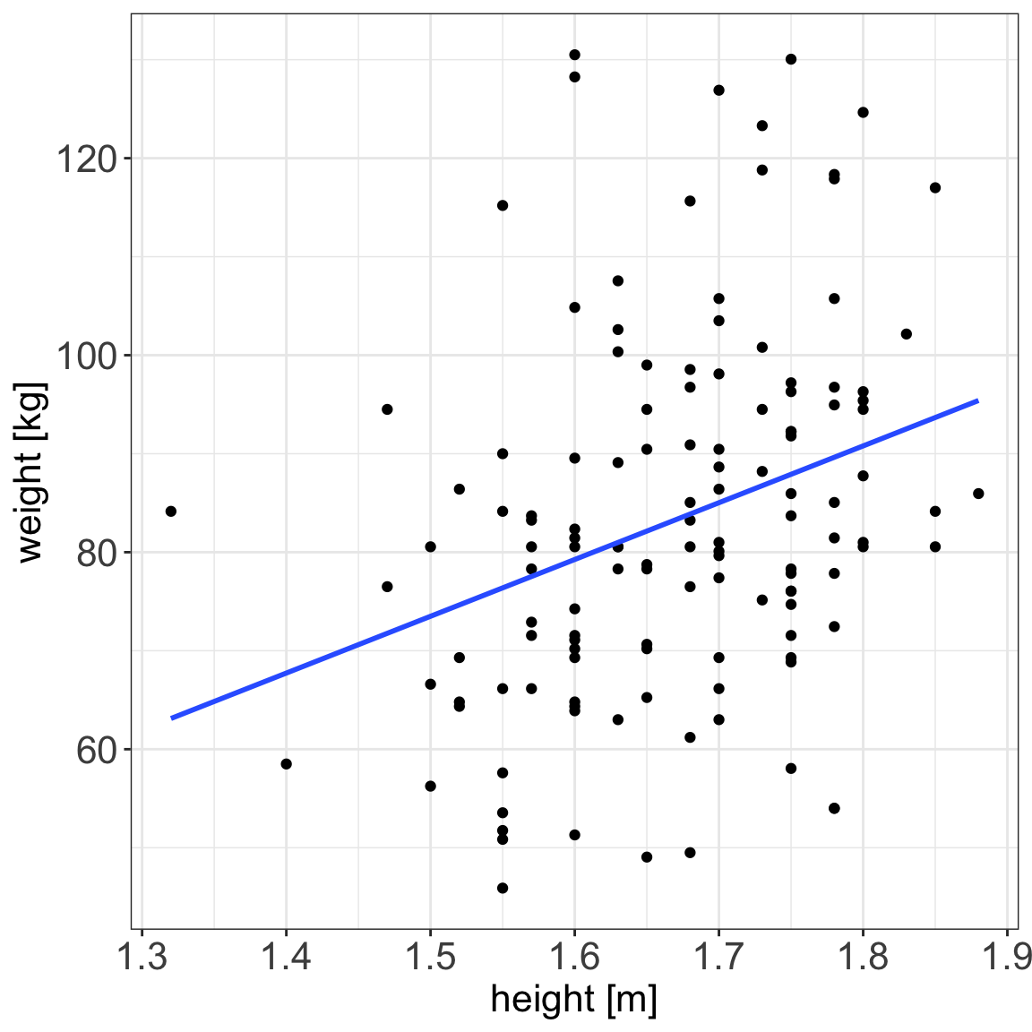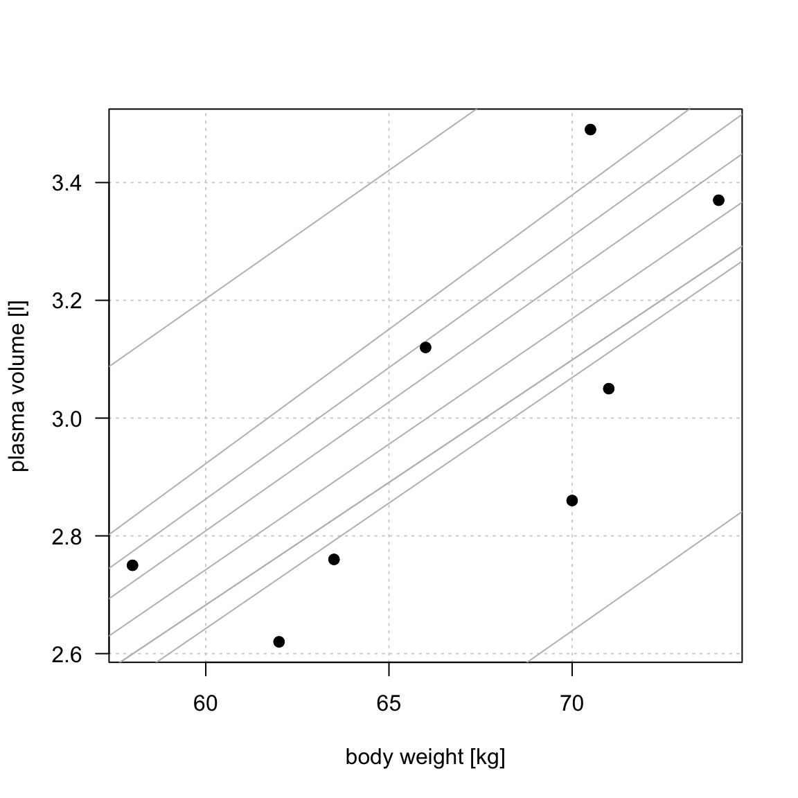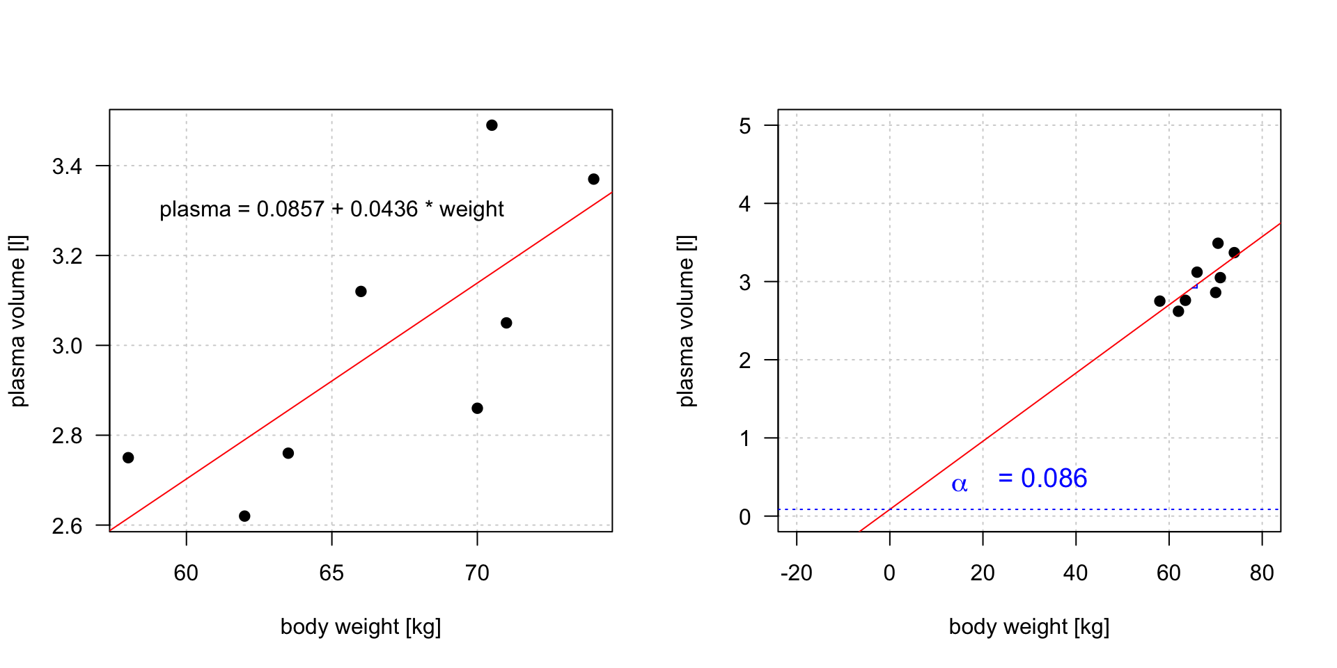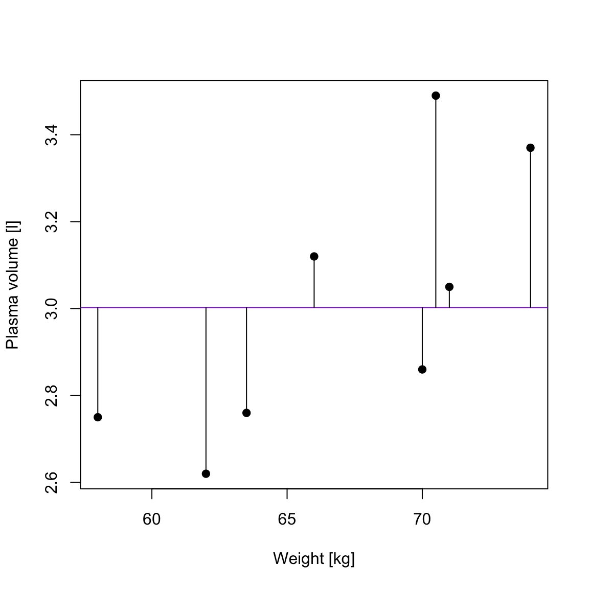 Example 1 (Weight and plasma volume) Let’s look at the example data containing body weight (kg) and plasma volume (liters) for eight healthy men to see what the best-fitting straight line is.