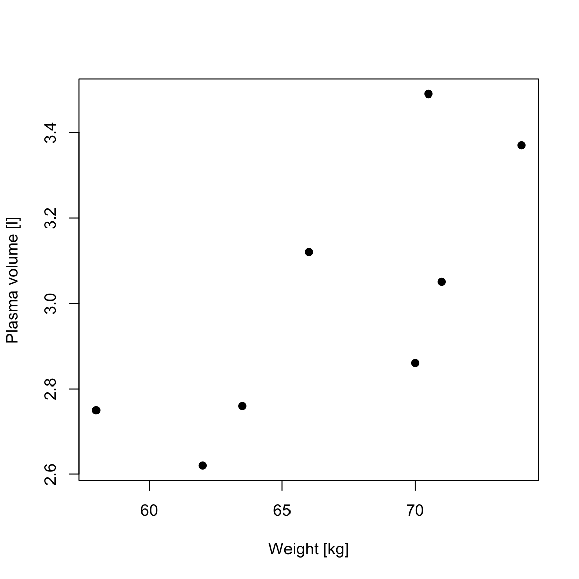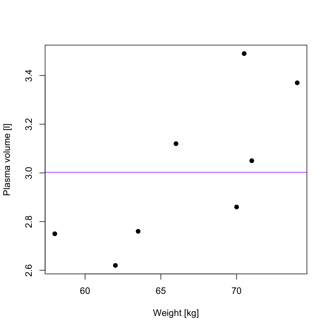 plasma <- c(2.75, 2.86, 3.37, 2.76, 2.62, 3.49, 3.05, 3.12) # plasma volume (liters)