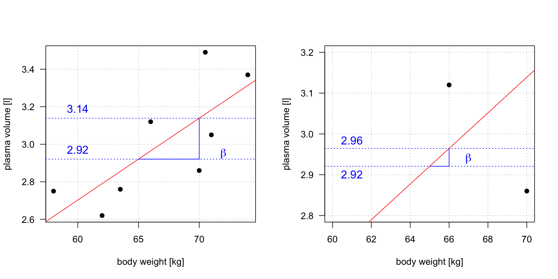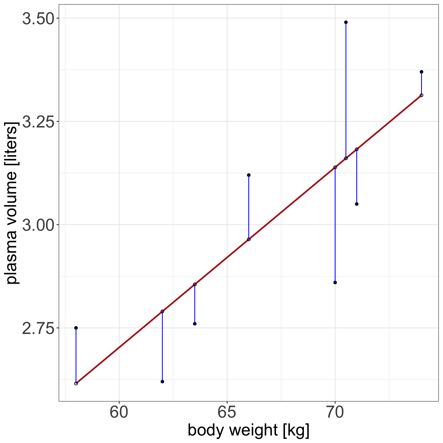 In other words, by finding the best-fitting straight line we are building a statistical model to represent the relationship between plasma volume (\(Y\)) and explanatory body weight variable (\(x\))