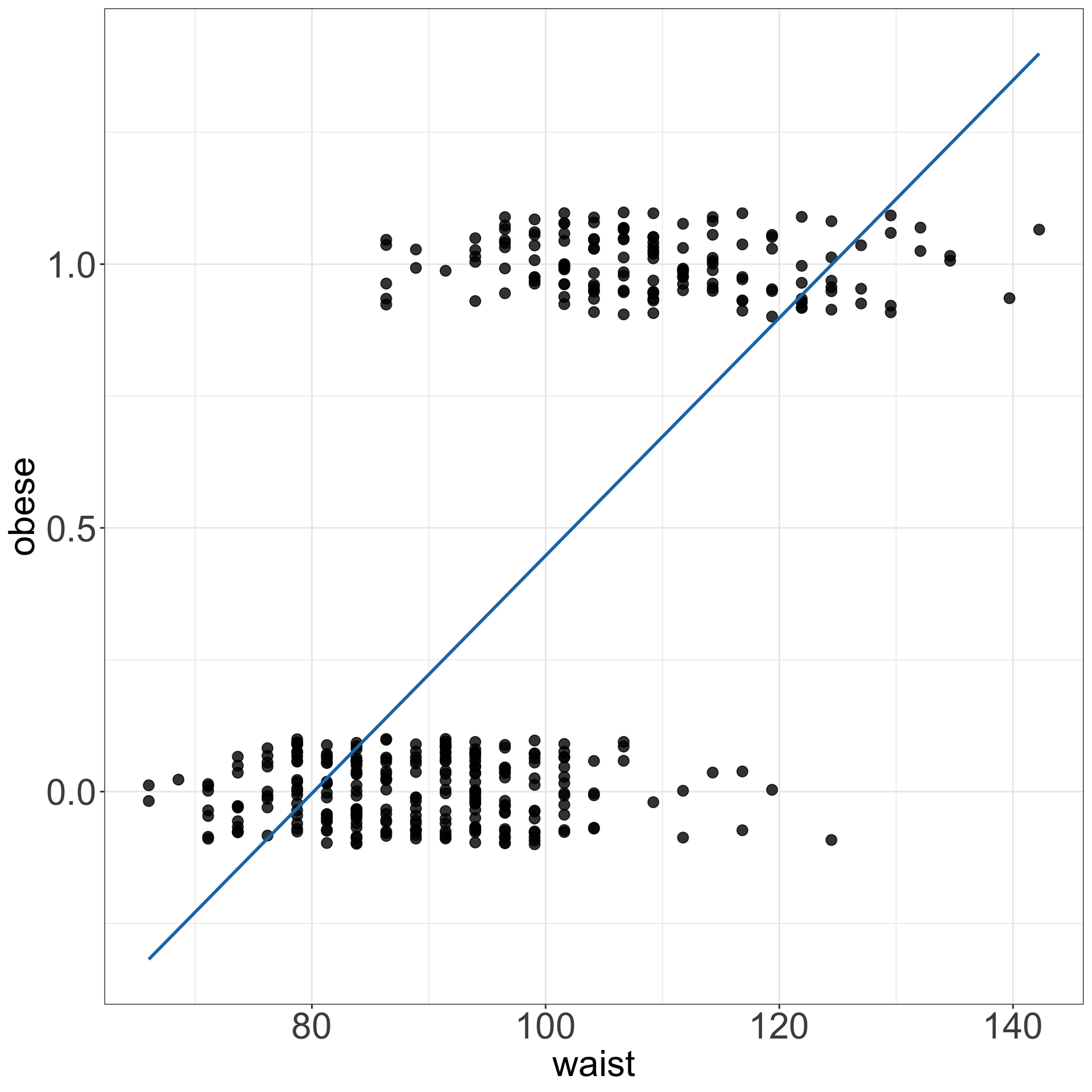 logmodel_1 <- glm(obese ~ waist, family = binomial(link="logit"), data = data_diabetes)