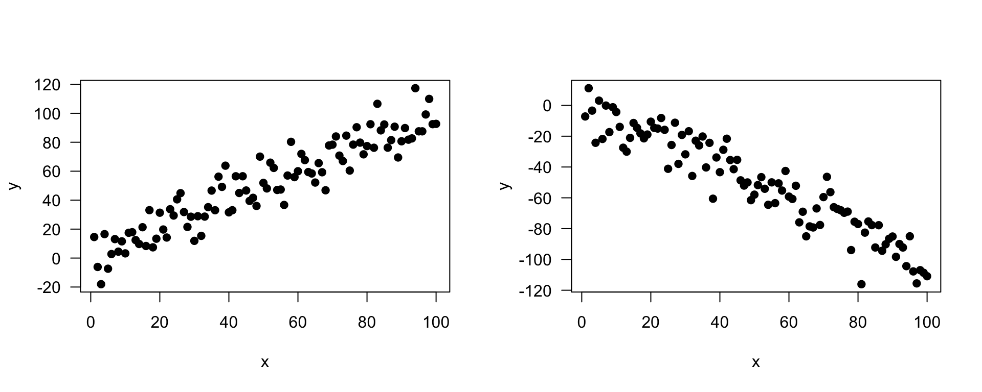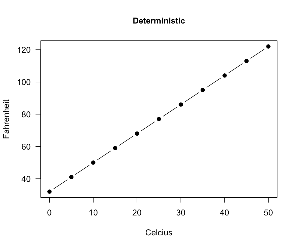 A deterministic relationship involves an exact relationship between two variables, for instance Fahrenheit and Celsius degrees is defined by an equation \(Fahrenheit=\frac{9}{5}\cdot Celcius+32\)