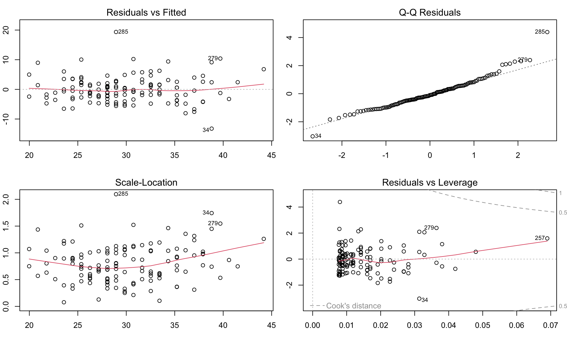 Residuals, \(\hat{\epsilon_i} = y_i - \hat{y_i}\) are the main ingredient to check model assumptions.