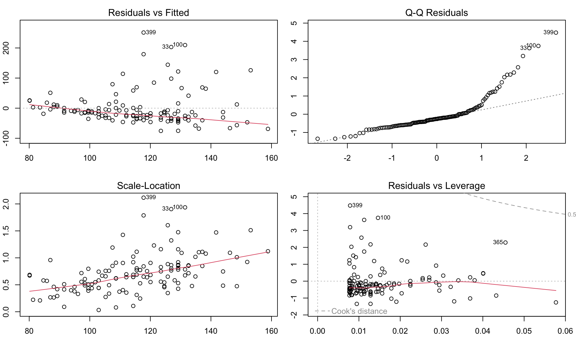 Diagnostic residual plots based on the lm() model used to assess whether the assumptions of linear models are met. Modeling glucose with age. Model assumptions seems to be violated, e.g. with residulas not following normal distributions.