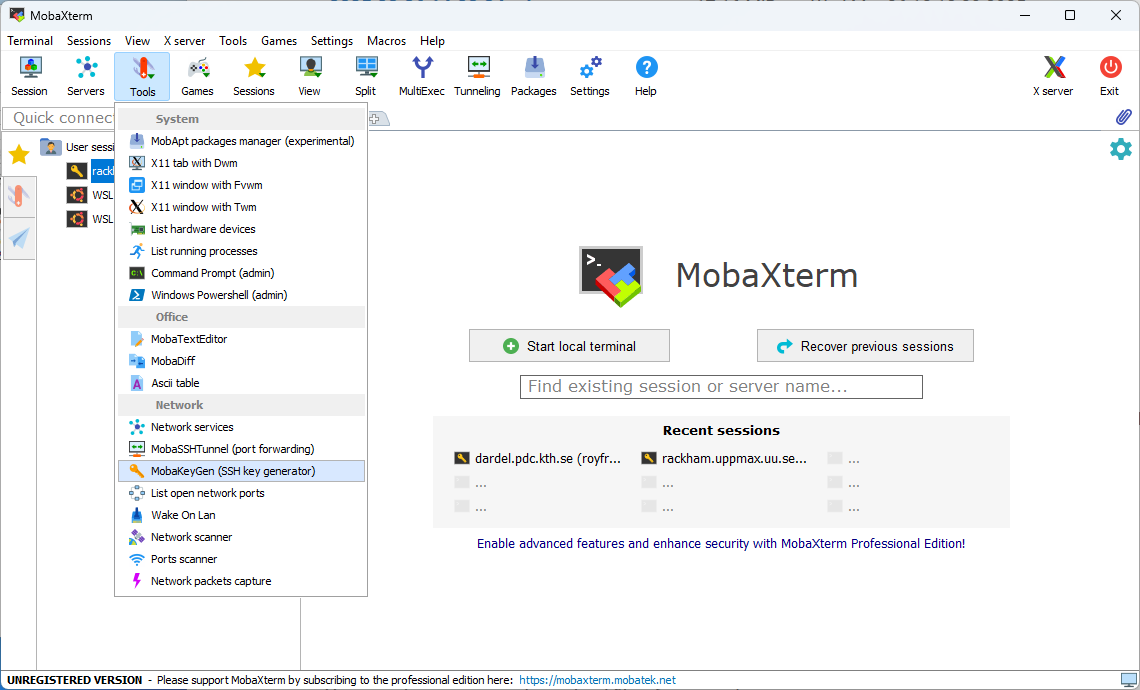 This will download a zip file. Extract the contents of the zip file first and then double click the installer to install MobaXterm. Start MobaXterm and click on Tools > MobaKeyGen (SSH key generator)