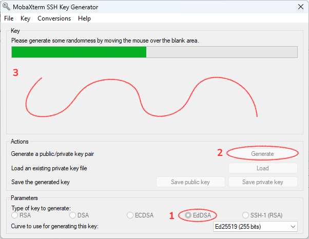 Select EdDSA, then click Generate and move your mouse around in the blank area to generate randomness.