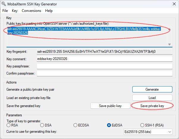 There are two pieces of information to save: the public key and the private key. Click Save private key and save it to a location you will remember. Then copy the public key which is displayed in the window.