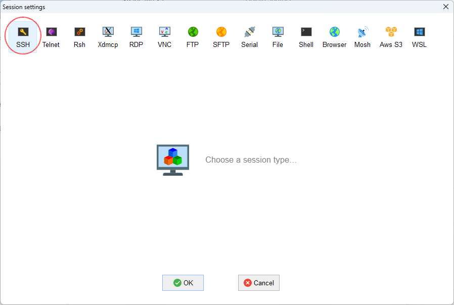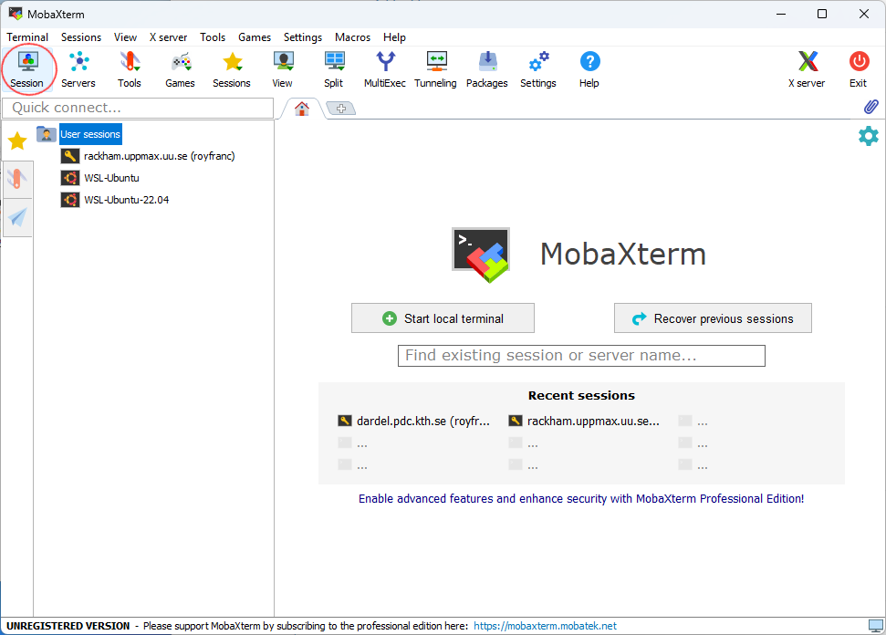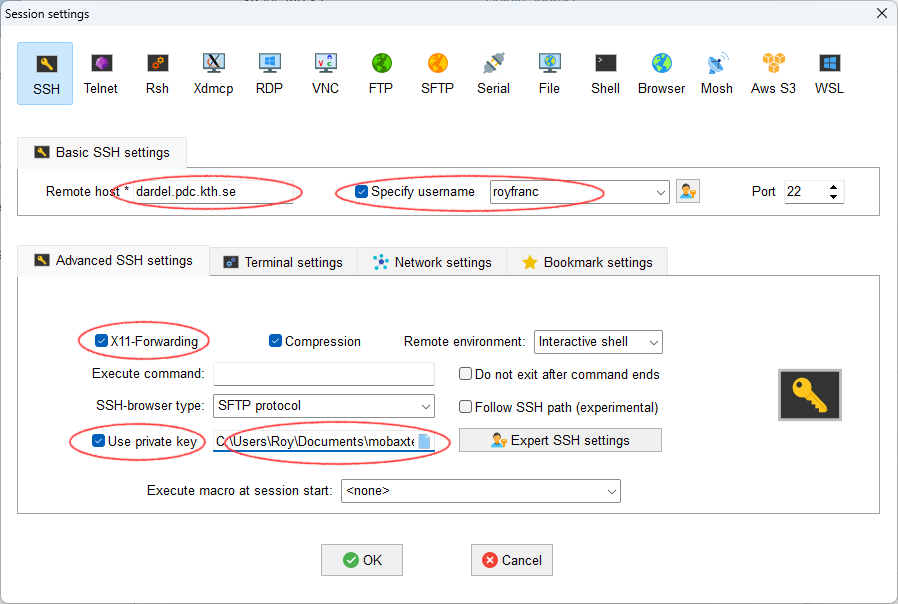 define one yourself, usually something like*.your.internetprovier.com. This will allow you to use this key as long as you are connecting from the same location as you are connecting now. If you want to use this key from another in the future you can add a similar pattern that matches e.g. your home university’s (or internet provider) hostname (e.g.*.uu.se,*.kth.seor*.telia.com).Then go back to MobaXterm, click Session followed by SSH and OK.