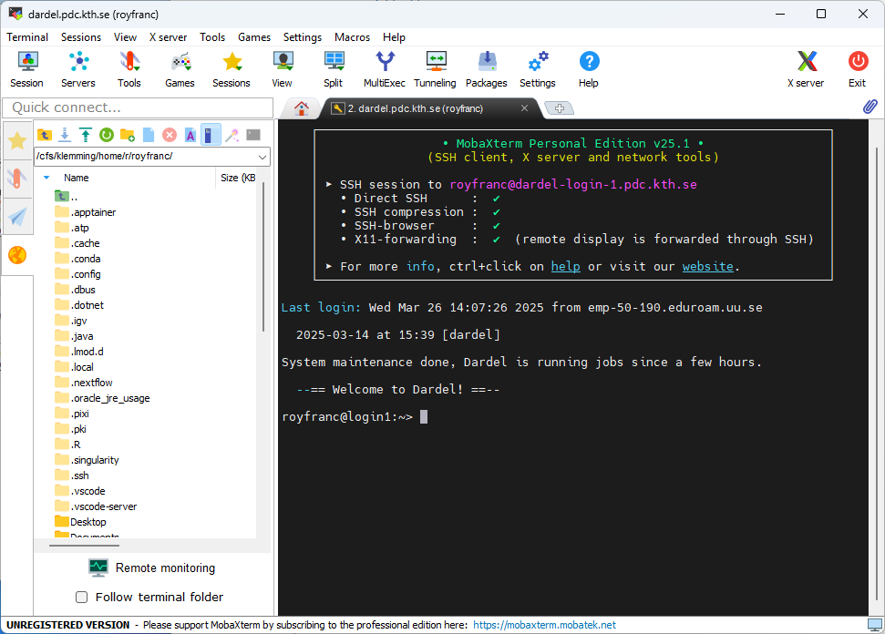 ssh username@dardel.pdc.kth.seEnter your password when prompted. As you type, nothing will show on the screen. No stars, no dots. It is supposed to be that way. Just type the password and press enter, it will be fine.