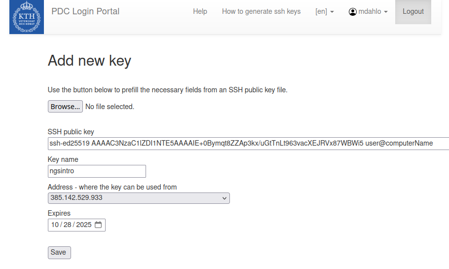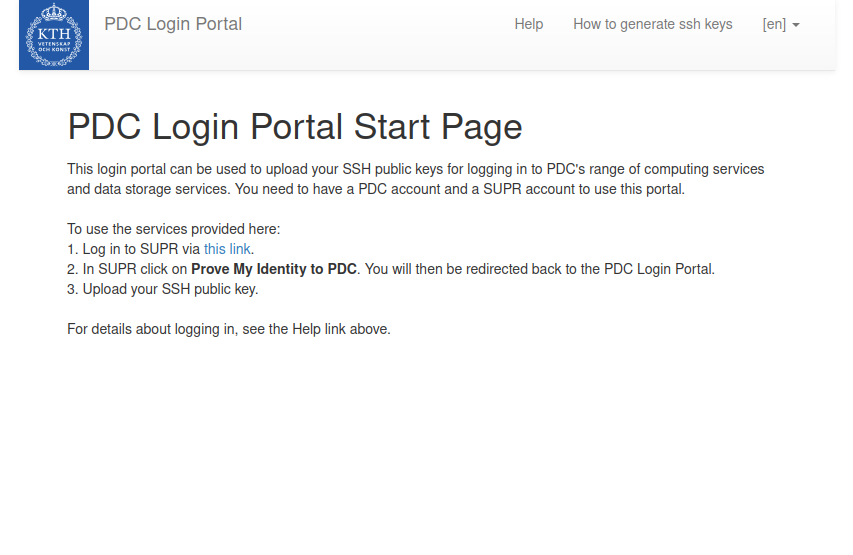 cat ~/.ssh/id_ed25519.pubTo register our public key, we will go to PDC login portal. Following a link from that page, you will login by first logging in to your SUPR account and then validating your identity to PDC through SUPR.