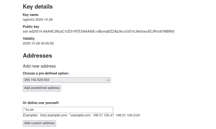 You have now added your public key and told PDC that it should be allowed to login using this key when you are connecting form the IP (385.142.529.933 in the screenshot above) you have at the moment. Since you might get new IPs for your computer each time you connect to the internet, we will have to add a broader list of allowed IPs for this key. Press Add address on the entry for the key you just added.