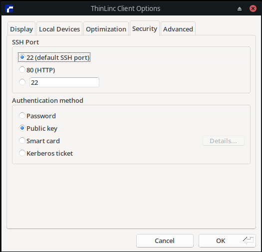 Options, select theSecuritytab and select authentication methodPublic key.Enter server