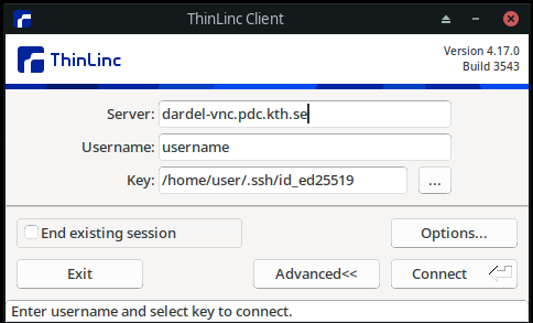 dardel-vnc.pdc.kth.se, your PDC username, and the path to your private SSH key.Press