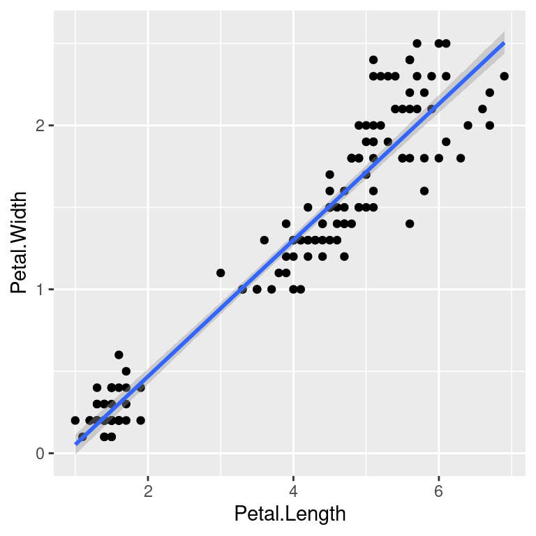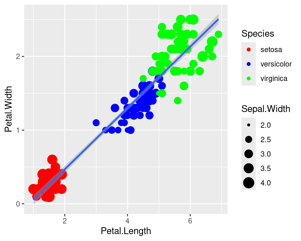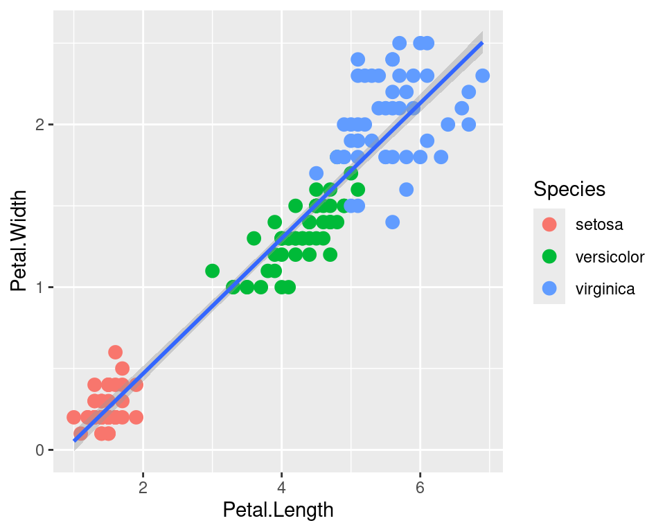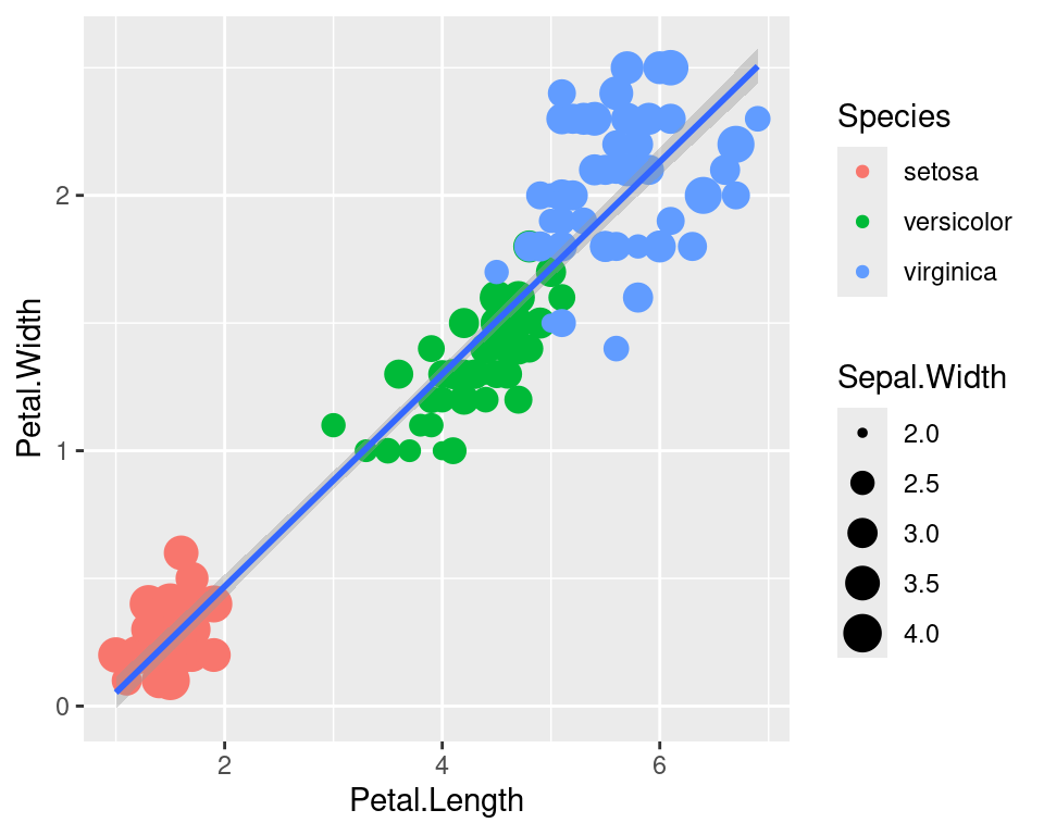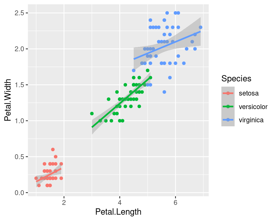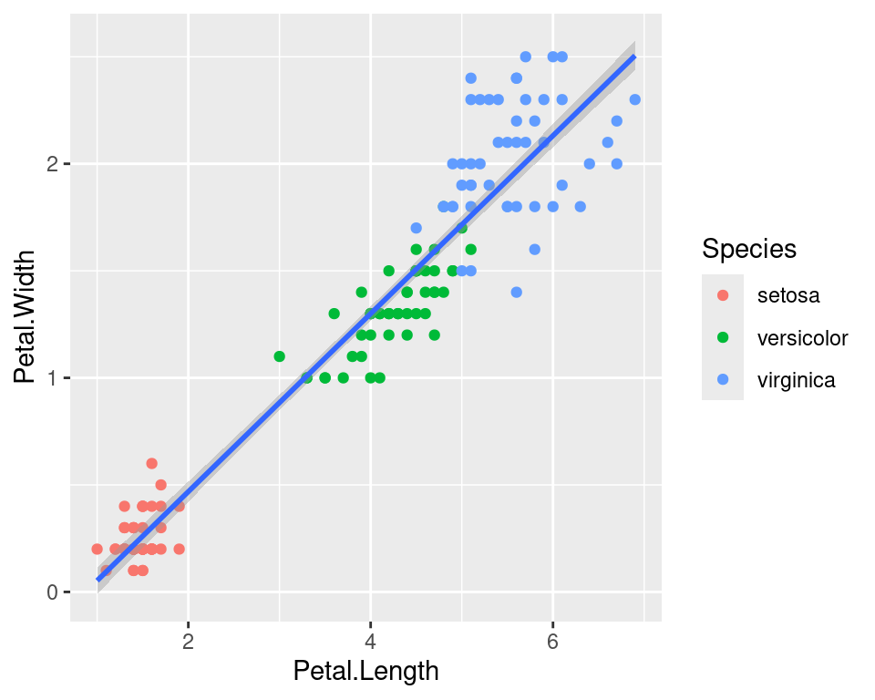 We can use the categorical column Species to color the points. The color aesthetic is used by geom_point and geom_smooth. Three different regression lines are now drawn. Notice that a legend is automatically created.