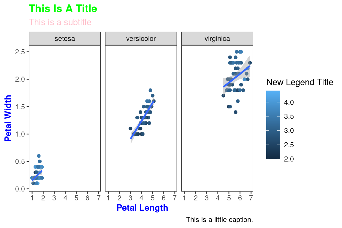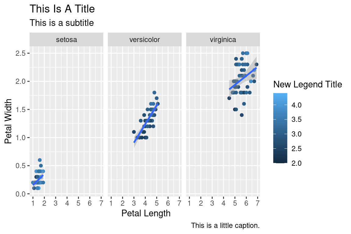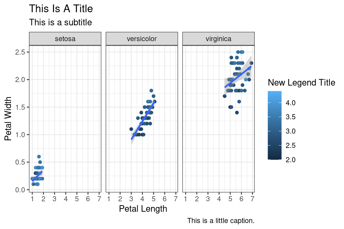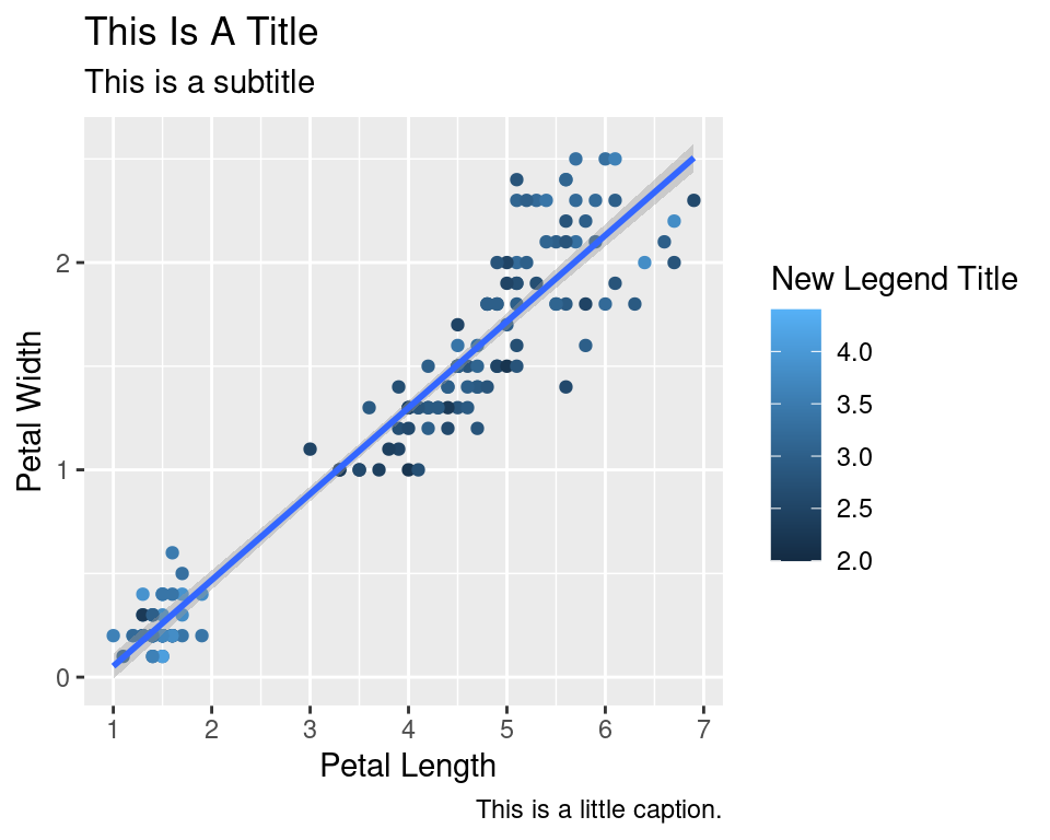 labs(title="This Is A Title",subtitle="This is a subtitle",x=" Petal Length",