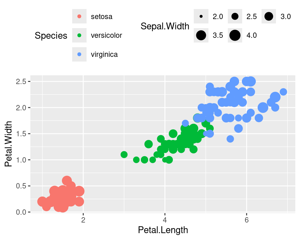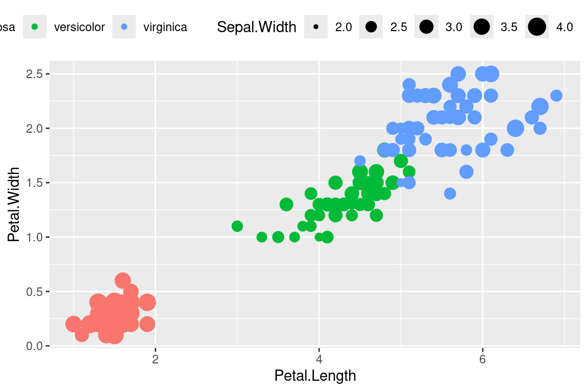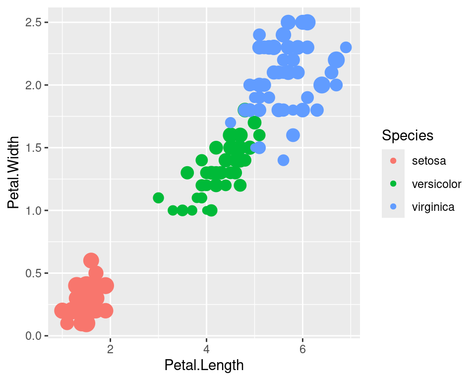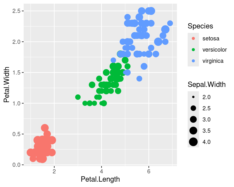 geom_point(aes(color=Species,size=Sepal.Width),show.legend=FALSE)