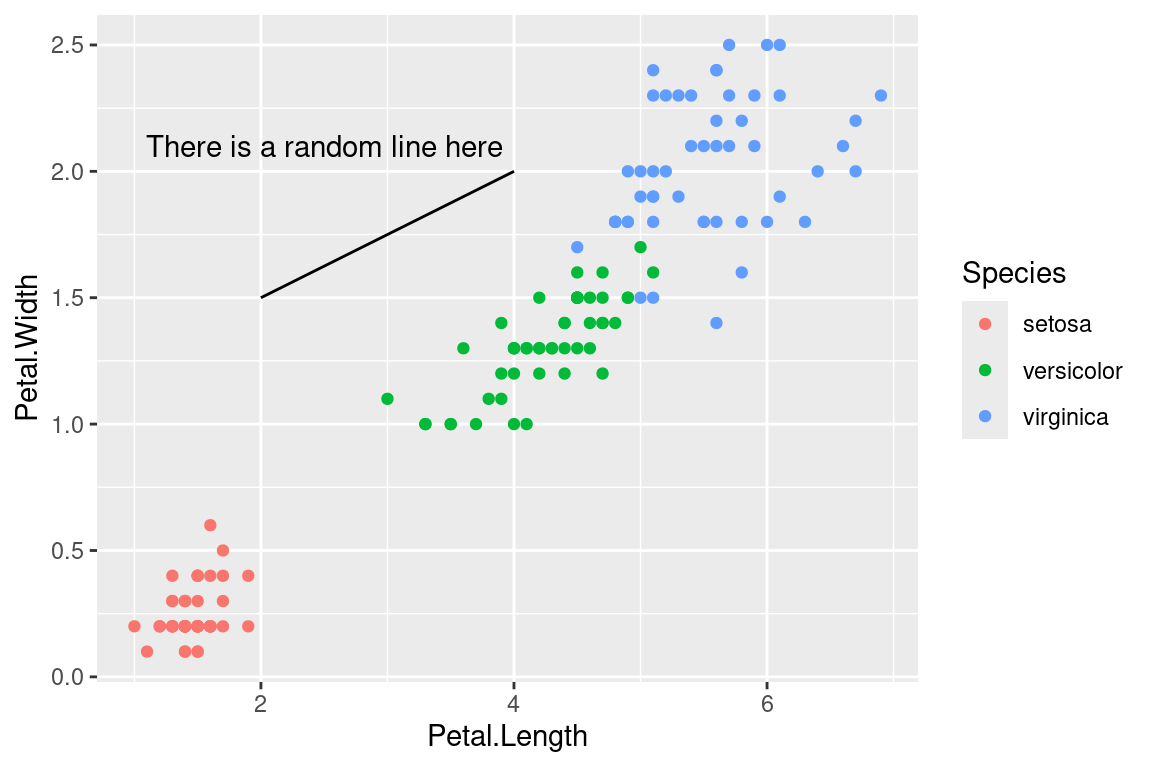 annotate("text",x=2.5,y=2.1,label="There is a random line here")+