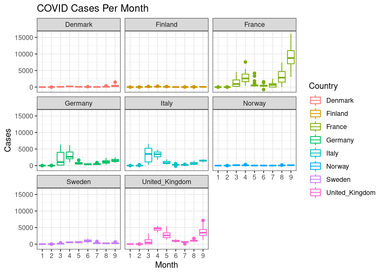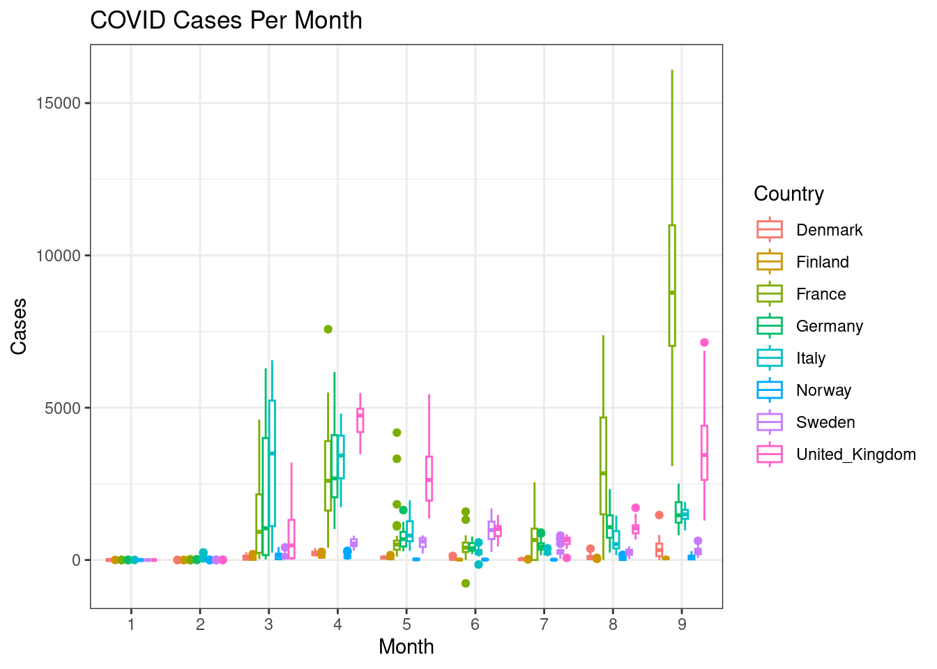 labs(x="Month",y="Cases",title="COVID Cases Per Month")+