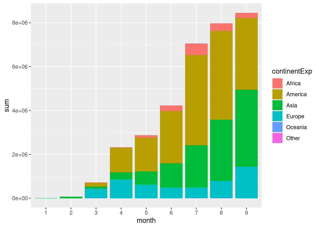 ggplot(aes(x=month,y=sum,fill=continentExp))+
