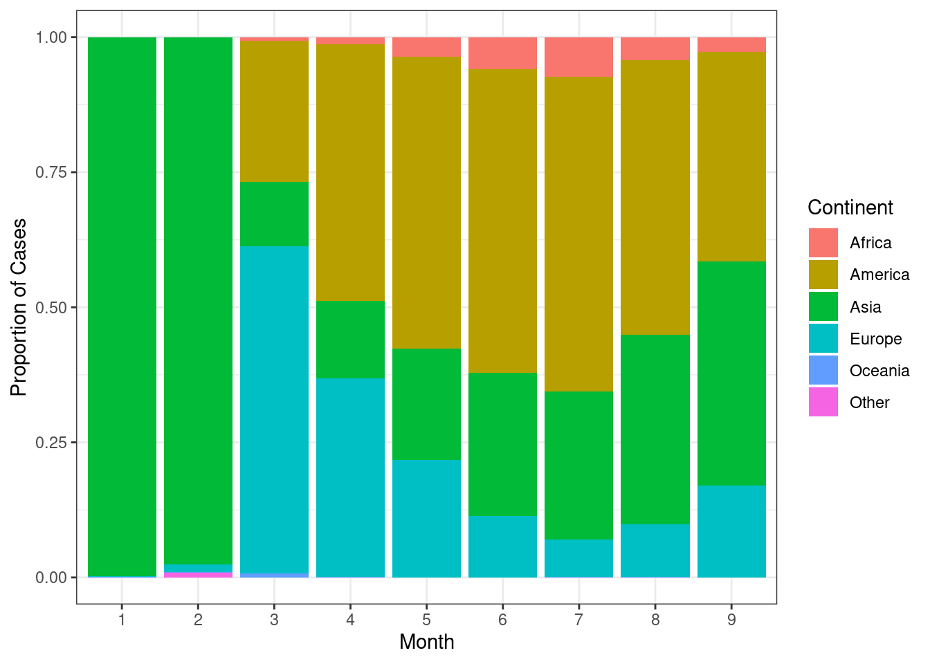 This figure shows the total number of cases per month across the globe. Continent-wise information shows that a large proportion of the cases are in America followed by Asia. The more common usage of stacked barplots is to show proportion/percentage rather than absolute counts (ie; all the bars are same height).