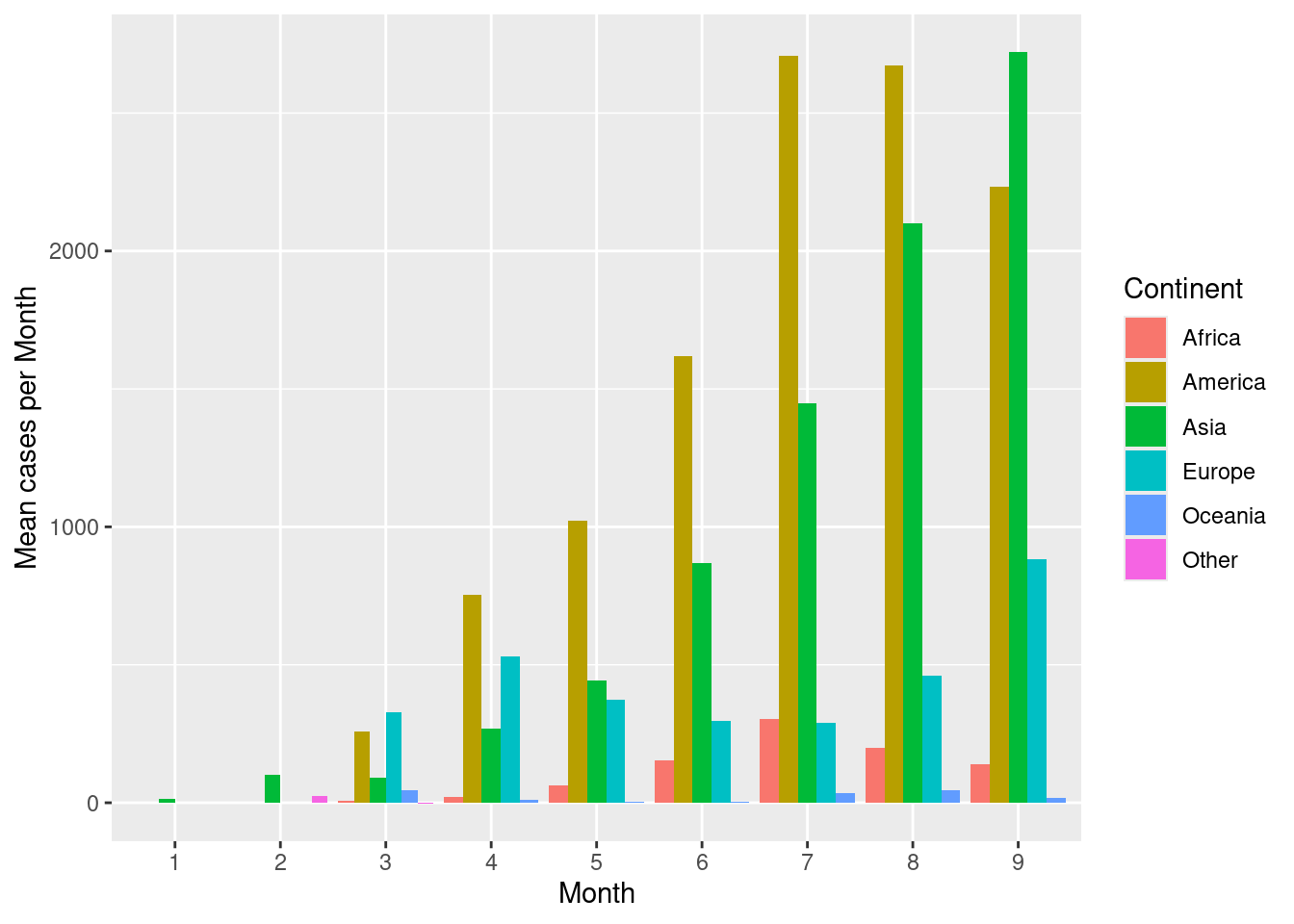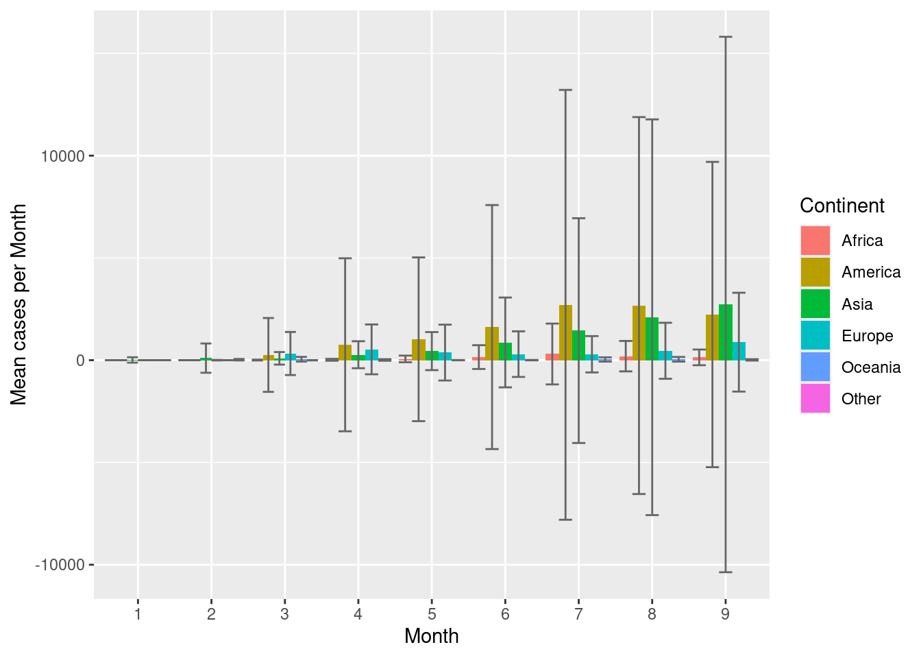 Now let’s look at barplots with error bars. First, create a barplot showing mean number of cases per continent per month. Place the bars within a group (month) next to each other rather than stack.