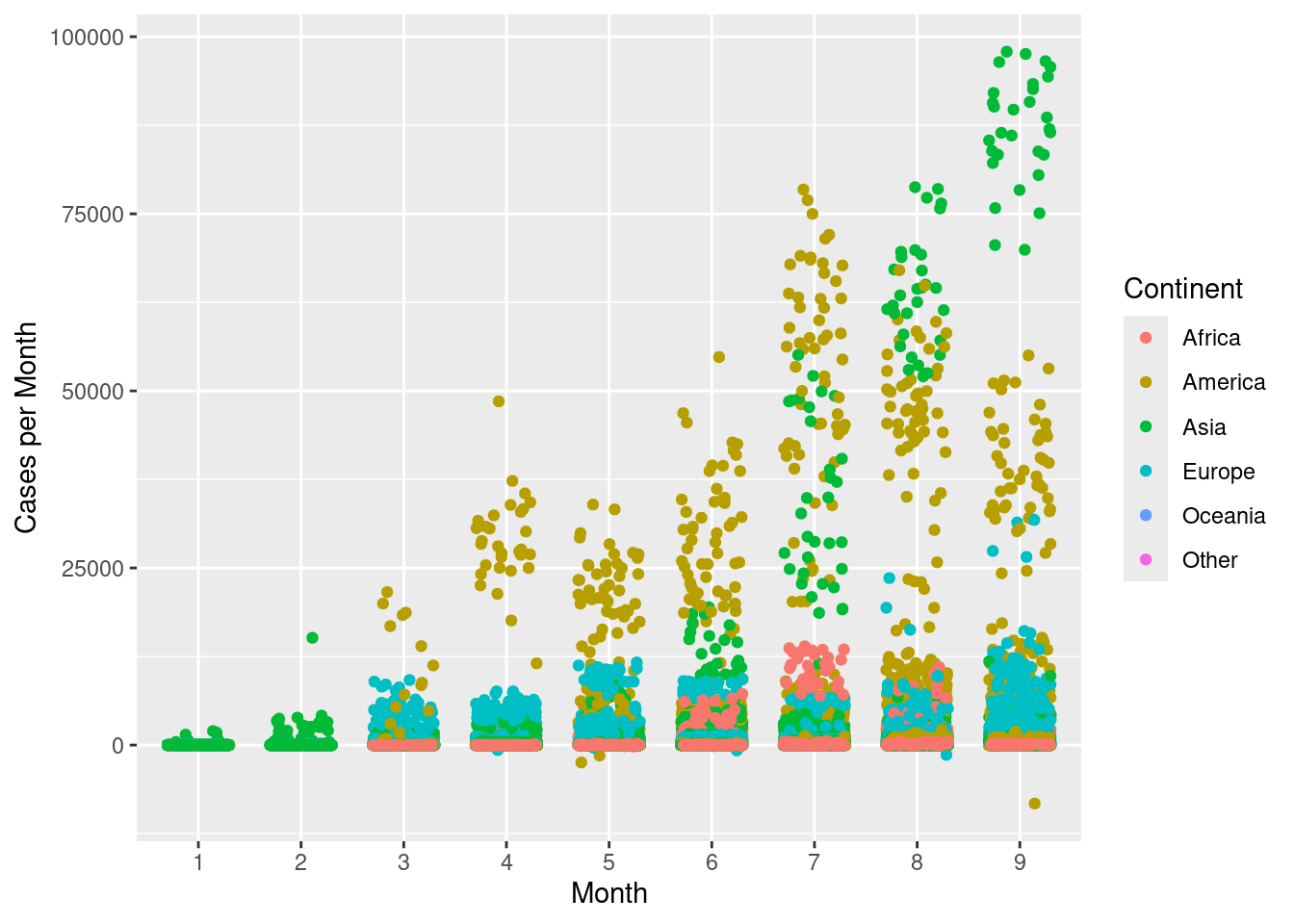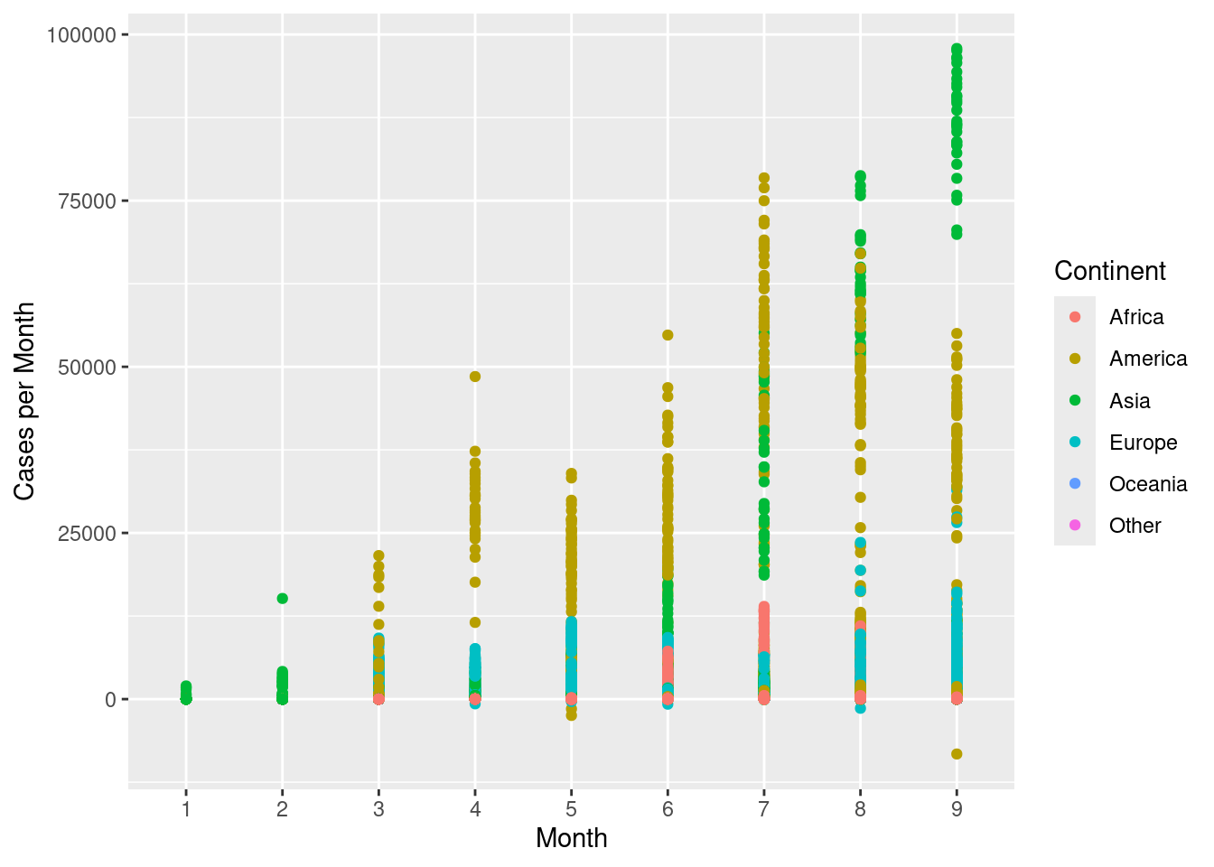 Scatterplots can also be used with categorical variables. Create a scatterplot with month on the x-axis and cases per month on the y-axis. Colour the points by continent.