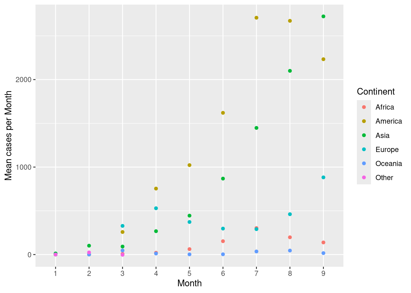 Create a scatterplot with month on the x-axis and mean cases per month on the y-axis. Colour the points by continent.