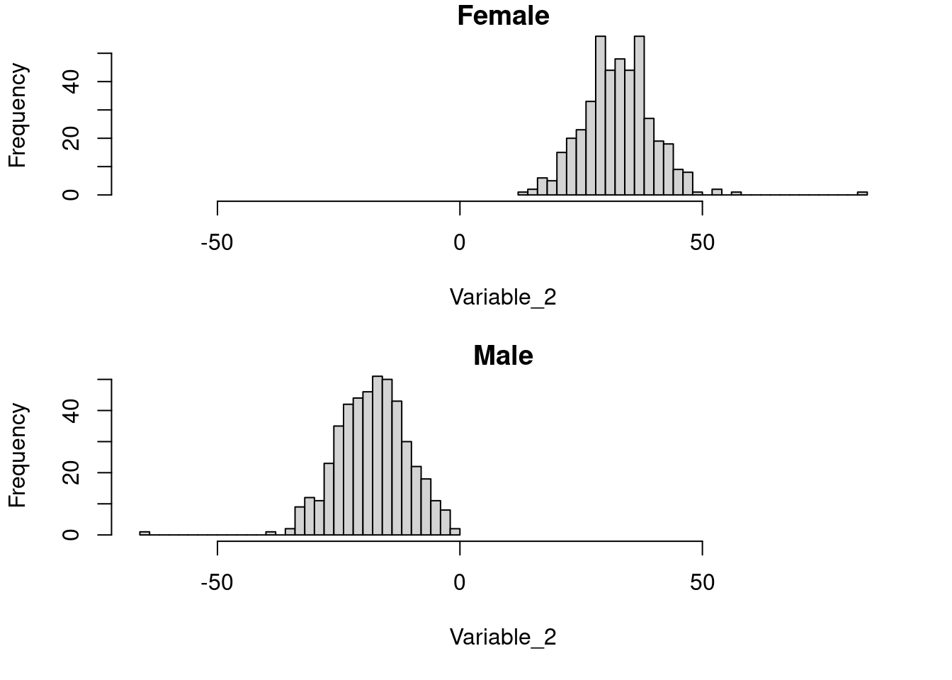 hist(dataset_m$Variable_2, main = 'Male', xlab = 'Variable_2', xlim = range_val, breaks = 30)