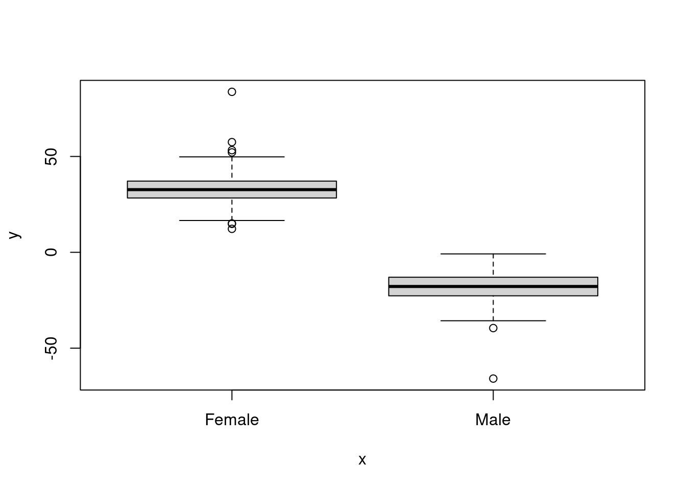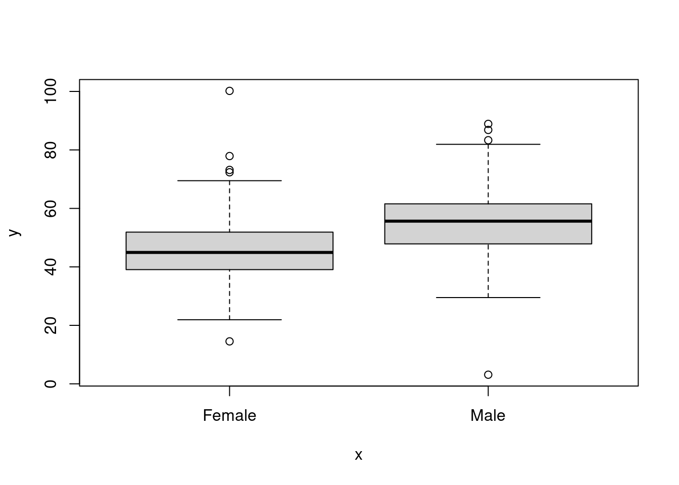 Gender vs Variable_1 or Variable_2. How do you interpret the result?plot((as.factor(dataset$Gender)), dataset$Variable_1)