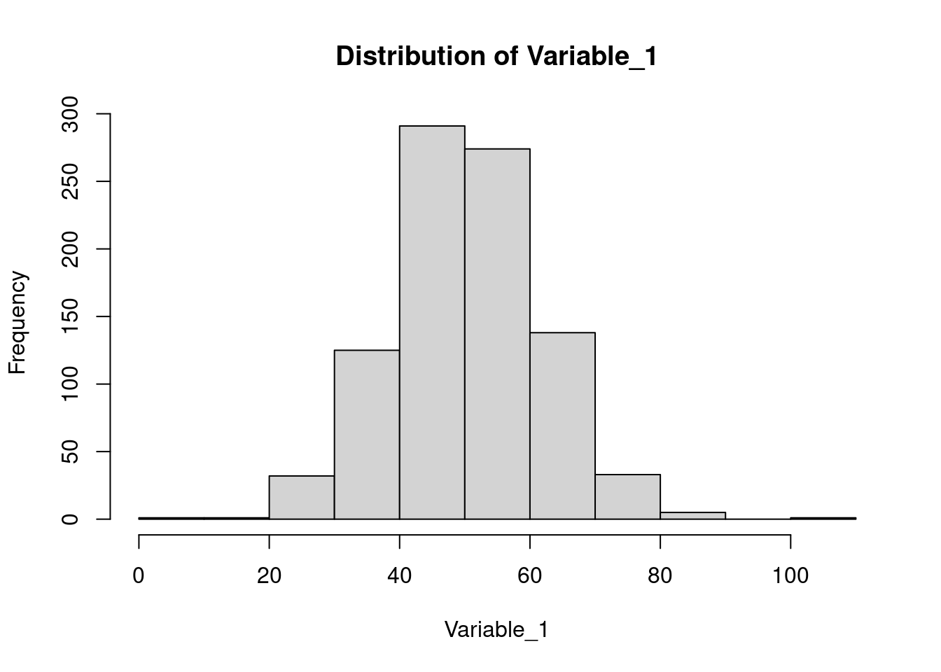 hist(dataset$Variable_1, main = 'Distribution of Variable_1', xlab = 'Variable_1')
