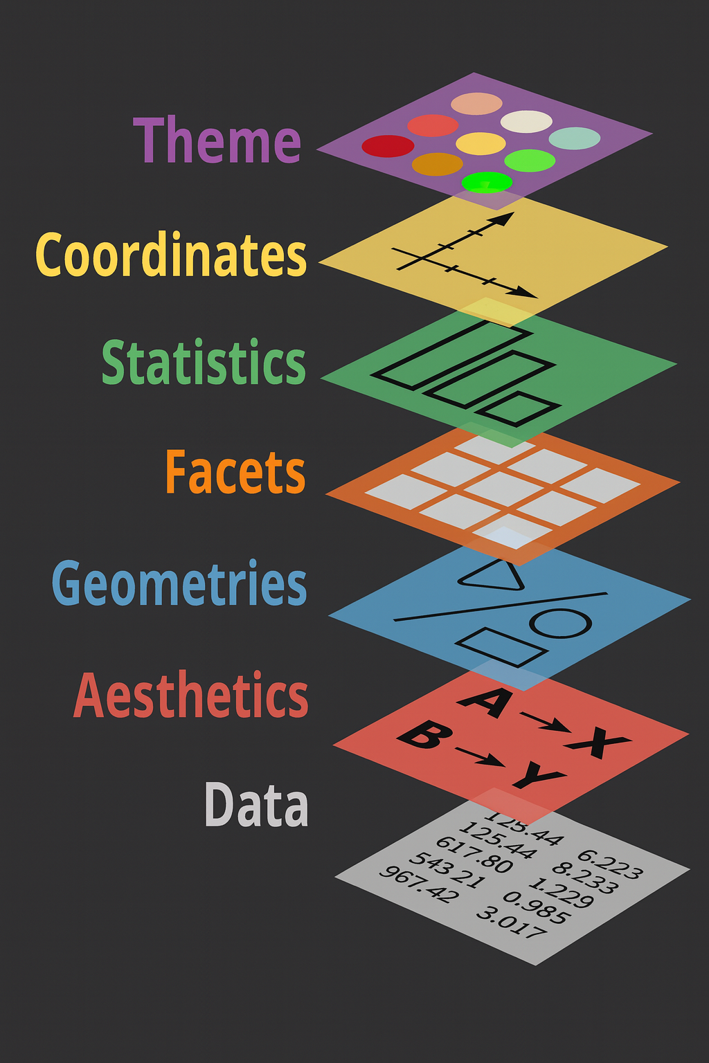 ] .subtitle[ ## R Foundations for Life Scientists ] .author[ ### Nima Rafati, Roy Francis ] --- exclude: true count: false <link href="https://fonts.googleapis.com/css?family=Roboto|Source+Sans+Pro:300,400,600|Ubuntu+Mono&subset=latin-ext" rel="stylesheet"> <link rel="stylesheet" href="https://use.fontawesome.com/releases/v5.3.1/css/all.css" integrity="sha384-mzrmE5qonljUremFsqc01SB46JvROS7bZs3IO2EmfFsd15uHvIt+Y8vEf7N7fWAU" crossorigin="anonymous"> <!-- ----------------- Only edit title & author above this ----------------- --> # Contents * [Why `ggplot2`?](#intro) * [Grammar of Graphics](#gog) * [Data](#data-iris) * [Geoms](#geom) * [Aesthetics](#aes) * [Scales](#scales-discrete-colour) * [Facets](#facet-wrap) * [Coordinates](#coordinate) * [Theme](#theme) * [Position](#position) * [Stat](#stat) * [Saving Plots](#save) * [Combining Plots](#comb) * [Interactive Plots](#interactive) * [Extensions](#extension) --- name: intro class: spaced # Why `ggplot2`? * Consistent code * Flexible * Automatic legends, colors etc * Save plot objects * Themes for reusing styles * Numerous add-ons/extensions * Nearly complete graphing solution -- Not suitable for: * 3D graphics ??? Why can't we just do everything is base plot? Of course, we could, but it's easier, consistent and more structured using `ggplot2`. There is bit of a learning curve, but once the code syntax and graphic building logic is clear, it becomes easy to plot a large variety of graphs. --- --- name: gog class: spaced # Grammar Of Graphics .pull-left-30[   ] -- .pull-right-70[ * **Data**: Input data * **Aesthetic**: Visual characteristics of the geometry. Size, Color, Shape etc * **Geom**: A geometry representing data. Points, Lines etc * **Scale**: How visual characteristics are converted to display values * **Statistics**: Statistical transformations. Counts, Means etc * **Coordinates**: Numeric system to determine position of geometry. Cartesian, Polar etc * **Facets**: Split data into subsets *recreated from Quebec Centre for Biodiversity Science* ] ??? `ggplot` was created by Hadley Wickham in 2005 as an implementation of Leland Wilkinson's book Grammar of Graphics. Different graphs have always been considered as independent entities and also labelled differently such as barplots, scatterplots, boxplots etc. Each graph has it's own function and plotting strategy. Grammar of graphics (GOG) tries to unify all graphs under a common umbrella. GOG brings the idea that graphs are made up of discrete components which can be mixed and matched to create any plot. This creates a consistent underlying framework to graphing. **Note:** aesthetic is sometimes also referred to as mappings and can be passed to main `ggplot()` or in individual geoms. But defining aesthetics in the main `ggplot()` call allows all subsequent layers to inherit these mappings automatically. --- name: syntax # Building A Graph: Syntax  -- <div style="font-size:80%"> | **Component** | **Purpose / Description** | |----------------------------|-------------------------------------------------------------------| | `data` | Dataset used for plotting. | | `mapping` (inside `aes()`) | Defines aesthetic mappings (e.g., x, y, color). | | `geom_function` | Specifies geometric object (e.g., `geom_point`, `geom_boxplot`). | | `stat` | Defines statistical transformation (e.g., `stat_bin`). | | `position` | Adjusts object placement (e.g., `position_dodge`). | | `coordinate_function` | Sets coordinate system (e.g., `coord_flip`, `coord_polar`). | | `facet_function` | Splits data into panels (e.g., `facet_wrap`, `facet_grid`). | | `scale_function` | Controls axes and legend scaling (e.g., `scale_x_log10`). | | `theme_function` | Adjusts visual style (e.g., `theme_bw`, `theme_minimal`). | --- name: gvb1 # Base Graphics vs `ggplot2` .pull-left-50[ ``` r hist(iris$Sepal.Length) ``` <img src="slide_ggplot2_files/figure-html/unnamed-chunk-3-1.png" width="288" style="display: block; margin: auto auto auto 0;" /> ] -- .pull-right-50[ ``` r library(ggplot2) ggplot(data = iris, aes(x=Sepal.Length)) + geom_histogram(bins=8) ``` <img src="slide_ggplot2_files/figure-html/unnamed-chunk-4-1.png" width="288" style="display: block; margin: auto auto auto 0;" /> ] ??? For simple graphs, the base plot seem to take minimal coding effort compared to a ggplot graph. --- name: gvb2 # Base Graphics vs `ggplot2` .pull-left-50[ ``` r # Plot plot(x = iris$Petal.Length, y = iris$Petal.Width, col=c("red","green","blue")[iris$Species], pch=c(0,1,2)[iris$Species]) # Legend legend(x=1,y=2.5, legend=c("setosa","versicolor","virginica"), pch=c(0,1,2),col=c("green","red","blue")) ``` <img src="slide_ggplot2_files/figure-html/unnamed-chunk-5-1.png" width="288" style="display: block; margin: auto auto auto 0;" /> -- **FIND THE ERROR!** ] -- .pull-right-50[ ``` r ggplot(data = iris, aes(x = Petal.Length, y = Petal.Width, color=Species))+ geom_point( aes(shape = Species)) ``` <img src="slide_ggplot2_files/figure-html/unnamed-chunk-6-1.png" width="360" style="display: block; margin: auto auto auto 0;" /> ] ??? For anything beyond extremely basic plots, base plotting quickly become complex. More importantly, base plots do not have consistency in it's functions or plotting strategy. --- name: build-1 # Building A Graph .pull-left-40[ ``` r ggplot(iris) ``` ] .pull-right-50[ <img src="slide_ggplot2_files/figure-html/unnamed-chunk-8-1.png" width="252" style="display: block; margin: auto auto auto 0;" /> ] --- name: build-2 # Building A Graph .pull-left-40[ ``` r ggplot(iris,aes(x=Sepal.Length, y=Sepal.Width)) ``` ] .pull-right-60[ <img src="slide_ggplot2_files/figure-html/unnamed-chunk-10-1.png" width="252" style="display: block; margin: auto auto auto 0;" /> ] --- name: build-3 # Building A Graph .pull-left-40[ ``` r ggplot(iris,aes(x=Sepal.Length, y=Sepal.Width))+ geom_point() ``` ] .pull-right-80[ <img src="slide_ggplot2_files/figure-html/unnamed-chunk-12-1.png" width="252" style="display: block; margin: auto auto auto 0;" /