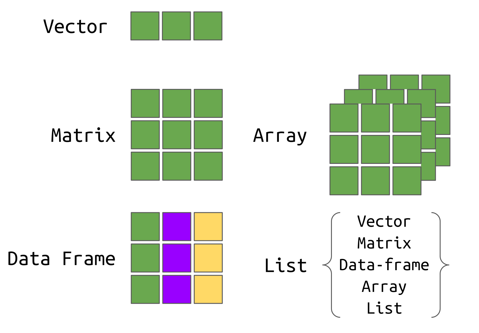 class: center, middle, inverse, title-slide .title[ # Vectors ] .subtitle[ ## R Foundations for Data Analysis ] .author[ ### Marcin Kierczak, Sebastian DiLorenzo, Guilherme Dias ] --- exclude: true count: false <link href="https://fonts.googleapis.com/css?family=Roboto|Source+Sans+Pro:300,400,600|Ubuntu+Mono&subset=latin-ext" rel="stylesheet"> <link rel="stylesheet" href="https://use.fontawesome.com/releases/v5.3.1/css/all.css" integrity="sha384-mzrmE5qonljUremFsqc01SB46JvROS7bZs3IO2EmfFsd15uHvIt+Y8vEf7N7fWAU" crossorigin="anonymous"> <!-- ------------ Only edit title, subtitle & author above this ------------ --> --- name: contents ## Contents of the lecture - variables and their types - operators - **vectors** - **numbers as vectors** - **strings as vectors** - matrices - data frames - lists <!-- - objects --> - repeating actions: iteration and recursion - decision taking: control structures - functions in general - variable scope - core functions --- name: cplx_data_str ## Complex data structures Using the basic data types (`numeric`, `logical` and `character`) one can construct more complex data structures: <br> <br> -- .pull-left-50[  ] .pull-right-50[ dimensions | Homogenous | Heterogenous ----|------------|----------------- 0 | n/a | n/a 1 | vectors | list 2 | matrices | data frame n | arrays | n/a ] --- name: atomic_vectors ## Atomic vectors An *atomic vector*, or simply a *vector*, is a sequence of elements of the same data type. We build vectors using the function `c()` (combine). ``` r vec <- c(1, 2, 3) vec ``` ``` ## [1] 1 2 3 ``` In R, even a single number is a one-element vector. Get used to think in terms of vectors... --- name: atomic_vectors2 ## Atomic vectors cted. You can also create empty/zero vectors of a given type and length: ``` r vector('integer', 5) # a vector of 5 integers vector('character', 5) character(5) # does the same logical(5) # same as vector('logical', 5) ``` ``` ## [1] 0 0 0 0 0 ## [1] "" "" "" "" "" ## [1] "" "" "" "" "" ## [1] FALSE FALSE FALSE FALSE FALSE ``` --- name: combining_vectors ## Combining two or more vectors Vectors can easily be combined: ``` r v1 <- c(1,2,3) v2 <- c('a','b','c') v3 <- c('do','re','mi') c(v1, v2, v3) ``` ``` ## [1] "1" "2" "3" "a" "b" "c" "do" "re" "mi" ``` Note that after combining numbers with characters, all elements became character. This is called a **coercion**. --- name: basic_vect_arithm ## Basic vector arithmetics We can perform operations on vectors: ``` r v1 <- c(1, 2, 3, 4) v2 <- c(7, -9, 15.2, 4) v1 + v2 # addition v1 - v2 # subtraction v1 * v2 # scalar multiplication v1 / v2 # division ``` ``` ## [1] 8.0 -7.0 18.2 8.0 ## [1] -6.0 11.0 -12.2 0.0 ## [1] 7.0 -18.0 45.6 16.0 ## [1] 0.1428571 -0.2222222 0.1973684 1.0000000 ``` --- name: recycling_rule ## Vectors – recycling rule ``` r v1 <- c(1, 2, 3, 4, 5) v2 <- c(0, 1) v1 + v2 ``` ``` ## [1] 1 3 3 5 5 ``` Values in the shorter vector will be **recycled** (repeated) to match the length of the longer one. In this case, `v2 <- c(0, 1)` becomes `v2 <- c(0, 1, 0, 1, 0)` so that it can be added to v1. --- name: vec_indexing ## Vectors – indexing We can access or retrieve particular elements of a vector by using the [] notation: ``` r vec <- c('a', 'b', 'c', 'd', 'e') vec[1] # the first element vec[5] # the fifth element vec[-1] # remove the first element ``` ``` ## [1] "a" ## [1] "e" ## [1] "b" "c" "d" "e" ``` --- name: vec_indexing2 ## Vectors – indexing cted. And what happens if we want to retrieve elements outside the vector? ``` r vec <- c('a', 'b', 'c', 'd', 'e') vec[0] # R counts elements from 1 vec[10] # Positive index past the length of the vector vec[-6] # Negative index past the length of the vector ``` ``` ## character(0) ## [1] NA ## [1] "a" "b" "c" "d" "e" ``` An index of **zero** will result in an empty vector of the same type as the original vector. A **positive** index beyond the vector's length will result in an `NA` value. A **negative** index beyond the vector's length will result in the full unchanged vector. Basically, R ignores your request. --- name: vec_indexing3 ## Vectors – indexing cted. You can also retrieve elements of a vector using a vector of indices: ``` r vec <- c('a', 'b', 'c', 'd', 'e') vec.ind <- c(1,3,5) vec[vec.ind] ``` ``` ## [1] "a" "c" "e" ``` -- Or even a logical vector: ``` r vec <- c('a', 'b', 'c', 'd', 'e') vec.ind <- c(TRUE, FALSE, TRUE, FALSE, TRUE) vec[vec.ind] ``` ``` ## [1] "a" "c" "e" ``` --- name: vec_indexing_names ## Vectors – indexing using names You can name elements of your vector: ``` r vec <- c(23.7, 54.5, 22.7) names(vec) # by default there are no names names(vec) <- c('sample1', 'sample2', 'sample3') vec vec[c('sample2', 'sample1')] ``` ``` ## NULL ## sample1 sample2 sample3 ## 23.7 54.5 22.7 ## sample2 sample1 ## 54.5 23.7 ``` --- name: vec_rem_elem ## Vectors – removing elements You can return a vector without certain elements: ``` r vec <- c(1, 2, 3, 4, 5) vec[-5] # without the 5-th element vec[-(c(1,3,5))] # without elements 1, 3, 5 ``` ``` ## [1] 1 2 3 4 ## [1] 2 4 ``` --- name: vec_conditions ## Vectors indexing – conditions Also logical expressions are allowed in indexing: ``` r vec <- c(1, 2, 3, 4, 5) vec < 3 # we can use the value of this logical comparison vec[vec < 3]# Et voila! ``` ``` ## [1] TRUE TRUE FALSE FALSE FALSE ## [1] 1 2 ``` --- name: vec_more_ops ## Vectors – more operations You can easily reverse a vector: ``` r vec <- c(1, 2, 3, 4, 5) rev(vec) ``` ``` ## [1] 5 4 3 2 1 ``` You can generate vectors of subsequent numbers using `:`, e.g.: ``` r v <- c(5:7) v v2 <- c(3:-4) v2 ``` ``` ## [1] 5 6 7 ## [1] 3 2 1 0 -1 -2 -3 -4 ``` --- name: vec_size ## Vectors – size To get the size of a vector, use `length()`: ``` r vec <- c(1:78) length(vec) ``` ``` ## [1] 78 ``` --- name: vec_subst_elem ## Vectors – substitute element To substitute an element in a vector simply: ``` r vec <- c(1:5) vec vec[3] <- 'a' # Note the coercion! vec ``` ``` ## [1] 1 2 3 4 5 ## [1] "1" "2" "