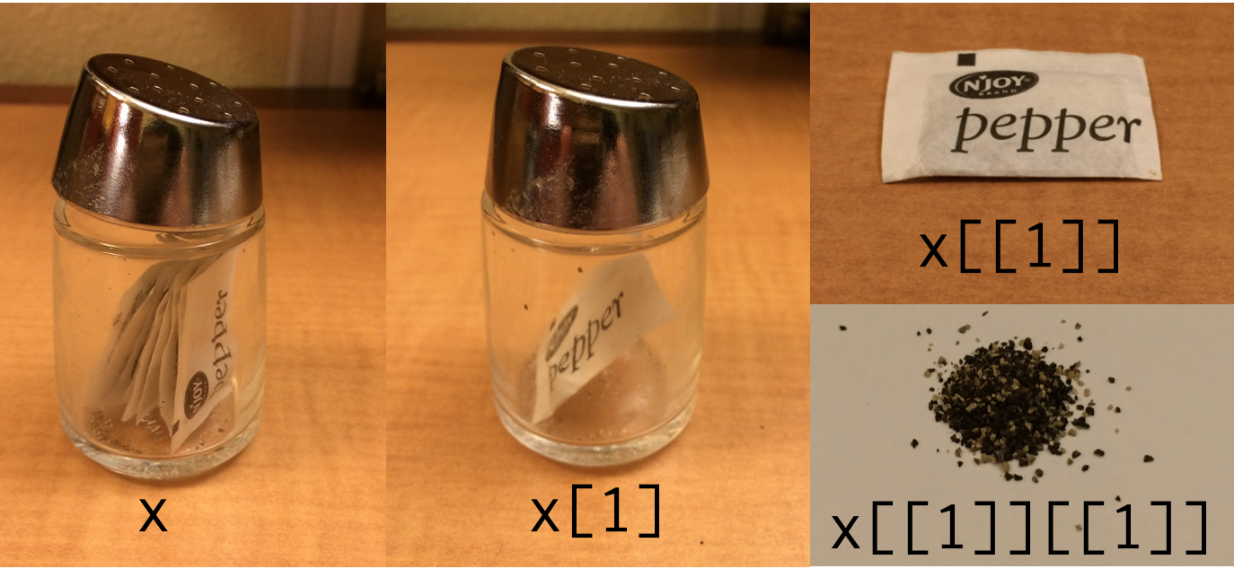 class: center, middle, inverse, title-slide .title[ # Matrices, Data Frames, and Lists ] .subtitle[ ## R Foundations for Data Analysis ] .author[ ### Marcin Kierczak, Guilherme Dias ] --- exclude: true count: false <link href="https://fonts.googleapis.com/css?family=Roboto|Source+Sans+Pro:300,400,600|Ubuntu+Mono&subset=latin-ext" rel="stylesheet"> <link rel="stylesheet" href="https://use.fontawesome.com/releases/v5.3.1/css/all.css" integrity="sha384-mzrmE5qonljUremFsqc01SB46JvROS7bZs3IO2EmfFsd15uHvIt+Y8vEf7N7fWAU" crossorigin="anonymous"> --- name: contents # Contents of the lecture - **matrices** - **data frames** - **lists** --- name: matrices # Matrices A **matrix** has 2 dimensions: rows and columns. Like vectors, elements must be of the same type. Say, we want to build this matrix in R: `$$\mathbf{X} = \left[\begin{array} {rrr} 1 & 2 & 3 \\ 4 & 5 & 6 \\ 7 & 8 & 9 \end{array}\right]$$` ``` r X <- matrix(1:9, nrow=3, ncol=3, byrow=T) X ``` ``` ## [,1] [,2] [,3] ## [1,] 1 2 3 ## [2,] 4 5 6 ## [3,] 7 8 9 ``` --- name: matrices_dim # Matrices — dimensions To check the dimensions of a matrix, use `dim()`: ``` r dim(X) # 3 rows and 3 columns ``` ``` ## [1] 3 3 ``` --- name: matrices_indexing # Matrices — indexing Elements of a matrix are retrieved using the `[]` notation. We have to specify 2 dimensions -- the rows and the columns: `$$\mathbf{X} = \left[\begin{array} {rrr} 1 & 2 & 3 \\ 4 & 5 & 6 \\ 7 & 8 & 9 \end{array}\right]$$` ``` r X[1,2] # 1st row, 2nd column X[3,] # entire 3rd row X[,2] # entire 2nd column ``` ``` ## [1] 2 ## [1] 7 8 9 ## [1] 2 5 8 ``` --- name: matrices_indexing_2 exclude: true # Matrices — indexing cted. `$$\mathbf{X} = \left[\begin{array} {rrr} 1 & 2 & 3 \\ 4 & 5 & 6 \\ 7 & 8 & 9 \end{array}\right]$$` ``` r X[c(1,3),] # Retrieve rows 1 and 3 X[c(1,3),c(3,1)] ``` ``` ## [,1] [,2] [,3] ## [1,] 1 2 3 ## [2,] 7 8 9 ## [,1] [,2] ## [1,] 3 1 ## [2,] 9 7 ``` --- name: matrices_oper_1 # Matrices — operations To order a matrix using the 2nd column: ``` r X <- matrix(sample(1:9,size = 9), nrow = 3) X ord <- order(X[,2]) X[ord,] ``` ``` ## [,1] [,2] [,3] ## [1,] 6 9 1 ## [2,] 7 2 4 ## [3,] 8 3 5 ## [,1] [,2] [,3] ## [1,] 7 2 4 ## [2,] 8 3 5 ## [3,] 6 9 1 ``` --- name: matrices_t # Matrices — transposition To **transpose** a matrix use `t()`: ``` r X <- matrix(c(10, 20, 30, 40, 50, 60), nrow = 2, ncol = 3, byrow = TRUE) ``` ``` r X t(X) ``` ``` ## [,1] [,2] [,3] ## [1,] 10 20 30 ## [2,] 40 50 60 ## [,1] [,2] ## [1,] 10 40 ## [2,] 20 50 ## [3,] 30 60 ``` --- name: matrices_oper_2 exclude: true # Matrices — operations 2 To get the diagonal of the matrix: ``` r X diag(X) # get values on the diagonal ``` ``` ## [,1] [,2] [,3] ## [1,] 10 20 30 ## [2,] 40 50 60 ## [1] 10 50 ``` --- name: matrices_tri exclude: true # Matrices — operations, triangles To get the upper or the lower triangle use `upper.tri()` and `lower.tri()` respectively: ``` r X # print X upper.tri(X) # which elements form the upper triangle X[upper.tri(X)] <- 0 # set them to 0 X # print the new matrix ``` ``` ## [,1] [,2] [,3] ## [1,] 10 20 30 ## [2,] 40 50 60 ## [,1] [,2] [,3] ## [1,] FALSE TRUE TRUE ## [2,] FALSE FALSE TRUE ## [,1] [,2] [,3] ## [1,] 10 0 0 ## [2,] 40 50 0 ``` --- name: matrices_multi # Matrices — multiplication Different types of matrix multiplication exist: ``` r A <- matrix(1:4, nrow = 2, byrow=T) B <- matrix(5:8, nrow = 2, byrow=T) A * B # Hadamard product ``` ``` ## [,1] [,2] ## [1,] 5 12 ## [2,] 21 32 ``` -- ``` r A %*% B # Matrix multiplication A %x% B # Kronecker product A %o% B # Outer product (tensor product) ``` ``` ## [,1] [,2] ## [1,] 19 22 ## [2,] 43 50 ## [,1] [,2] [,3] [,4] ## [1,] 5 6 10 12 ## [2,] 7 8 14 16 ## [3,] 15 18 20 24 ## [4,] 21 24 28 32 ## , , 1, 1 ## ## [,1] [,2] ## [1,] 5 10 ## [2,] 15 20 ## ## , , 2, 1 ## ## [,1] [,2] ## [1,] 7 14 ## [2,] 21 28 ## ## , , 1, 2 ## ## [,1] [,2] ## [1,] 6 12 ## [2,] 18 24 ## ## , , 2, 2 ## ## [,1] [,2] ## [1,] 8 16 ## [2,] 24 32 ``` --- name: matrices_outer # Matrices — outer Outer product can be useful for generating combinations ``` r outer(letters[1:4], LETTERS[1:4], paste, sep="-") ``` ``` ## [,1] [,2] [,3] [,4] ## [1,] "a-A" "a-B" "a-C" "a-D" ## [2,] "b-A" "b-B" "b-C" "b-D" ## [3,] "c-A" "c-B" "c-C" "c-D" ## [4,] "d-A" "d-B" "d-C" "d-D" ``` --- name: matrices_expand_grid exclude: true # Expand grid But `expand.grid()` is more convenient when you want, e.g. generate combinations of variable values: ``` r expand.grid(height = seq(120, 121), weight = c('1-50', '51+'), sex = c("Male","Female")) ``` ``` ## height weight sex ## 1 120 1-50 Male ## 2 121 1-50 Male ## 3 120 51+ Male ## 4 121 51+ Male ## 5 120 1-50 Female ## 6 121 1-50 Female ## 7 120 51+ Female ## 8 121 51+ Female ``` --- name: matrices_apply # Matrices — apply If we want to have mean of each column: ``` r X apply(X, MARGIN=2, mean) # 1 = rows, 2 = columns ``` ``` ## [,1] [,2] [,3] ## [1,] 10 0 0 ## [2,] 40 50 0 ## [1] 25 25 0 ``` -- And we can use any function ``` r myfunction <- function(x){ sum(x) + mean(x) + sqrt(sum(x)) } apply(X, MARGIN=2, myfunction) ``` ``` ## [1] 82.07107 82.07107 0.00000 ``` --- name: matrices_apply_2 exclude: true # Matrices — apply cted. And now we will use `apply()` to calculate for each element in a matrix its deviation from the mean squared: ``` r X my.mean <- mean(X) apply(X, MARGIN=c(1,2), function(x, my.mean) (x - my.mean)^2, my.mean) ``` ``` ## [,1] [,2] [,3] ## [1,] 10 0 0 ## [2,] 40 50 0 ## [,1] [,2] [,3] ## [1,] 44.44444 277.7778 277.7778 ## [2,] 544.44444 1111.1111 277.7778 ``` --- name: matrices_colSums # Matrices — useful fns. There are pre-made functions for common operations: ``` r X # instead of apply(X, MARGIN=2, mean) colMeans(X) ``` ``` ## [,1] [,2] [,3] ## [1,] 10 0 0 ## [2,] 40 50 0 ## [1] 25 25 0 ``` These functions are faster! --- name: matrices_add_row_col # Matrices — inserting rows/columns To add rows or columns to a matrix; or to make a matrix out of two or more vectors of equal length: ``` r x 