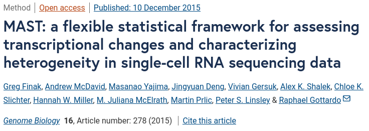 "MAST" : Identifies differentially expressed genes between two groups of cells using a hurdle model tailored to scRNA-seq data. Utilizes the MAST package to run the DE testing.