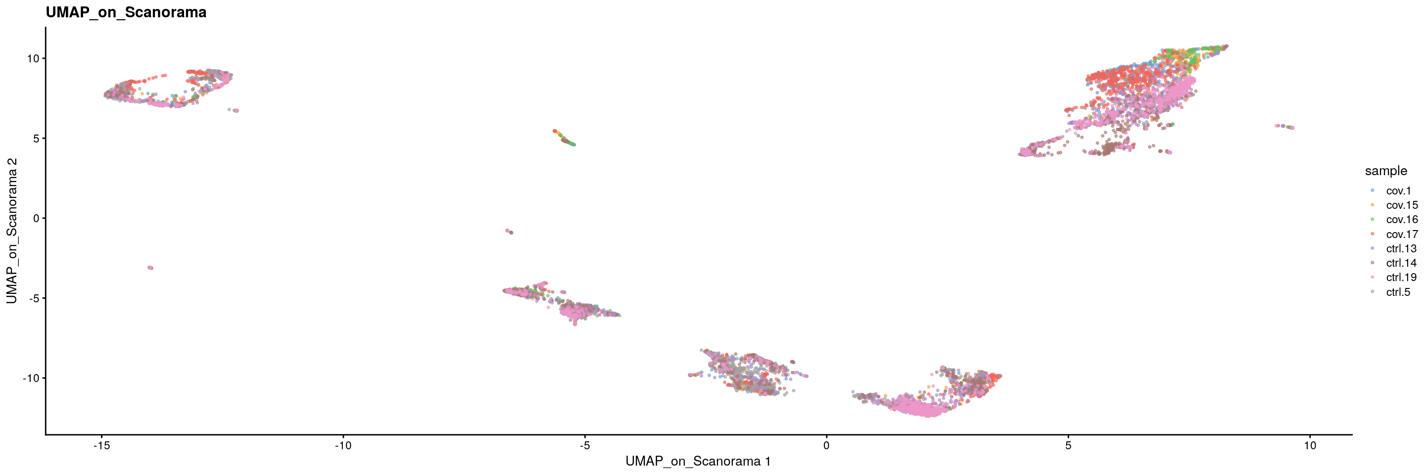 Another integration method is Scanorama (see Nat. Biotech.). This method is implemented in python, but we can run it through the Reticulate package.